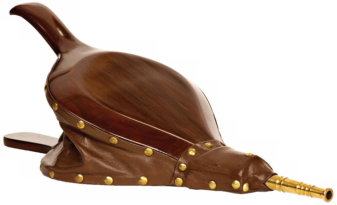 Make starting your fire a breeze with the addition of a bellows to your fireplace accessories. Instead of waiting patiently for the wood to catch, use a bellows to fuel your fire. Constructed of solid wood with a beautiful maple finish and studded leather sides. Features a hole in the bottom to bring in air and a solid brass nozzle to direct it toward the fire.