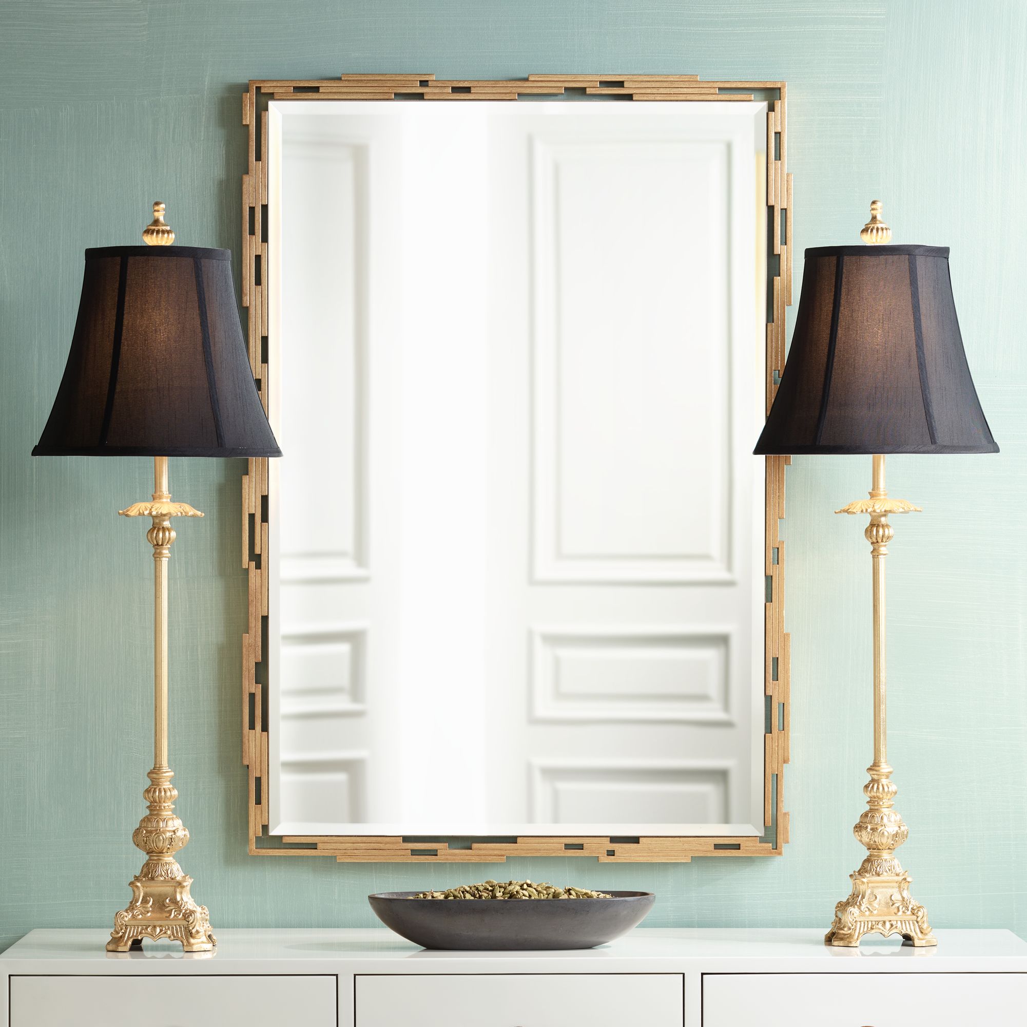 The wonderful iron frame of this rectangular wall mirror is crafted of small iron slats in glistening gold leaf finish. The slats are arranged randomly four rows high, which creates rectangles of open space throughout its modern design. This beveled glass mirror can be hung horizontally or vertically.