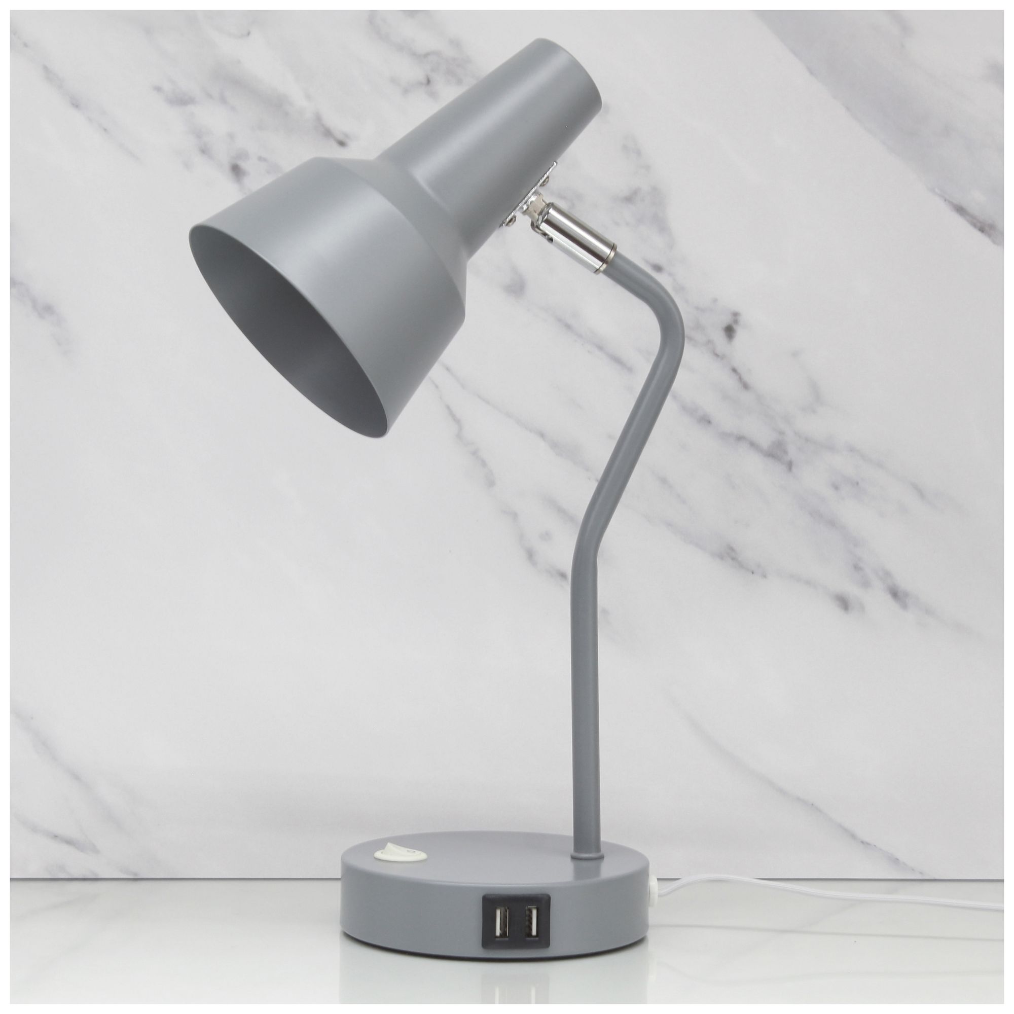 Simple Designs 15.2" Sleek Metal Desk Lamp, Adj Shade, Dual USB Ports, Gray
