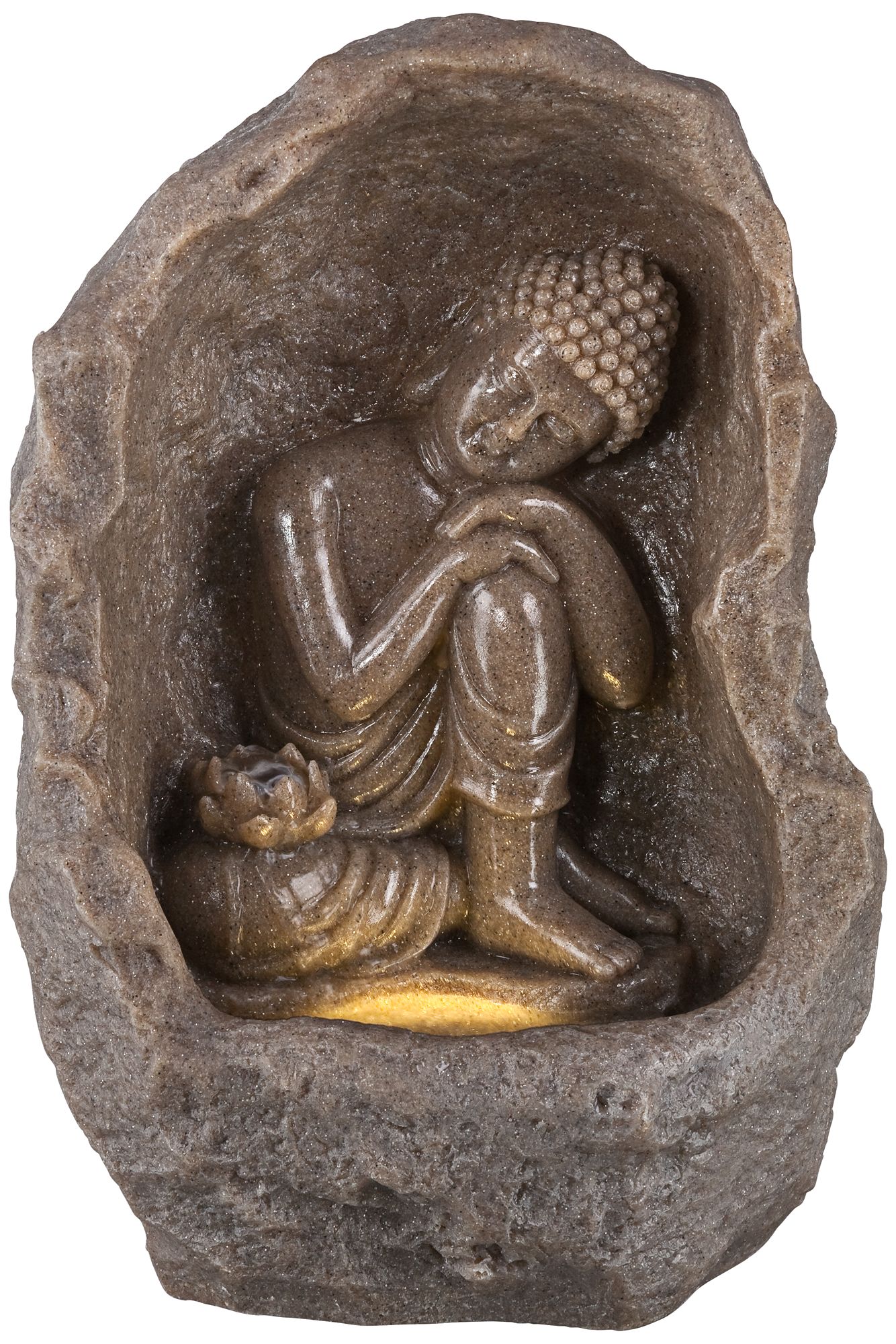 Add a Zen quality to home or office decor with this Sitting Buddha Fountain. It features an intricately detailed figure resting calmly within a stone finish cave. With the sound of running water, it adds tranquility to the living area or workspace.
