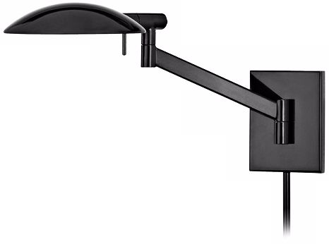 This contemporary plug-in wall lamp from Robert Sonneman features a modified pharmacy lamp design and gloss black finish. Ideal anywhere you need more light for reading or other tasks. The head rotates 350 degrees and the shade rotates 180 degrees. A high/low switch lets you choose your light level.
