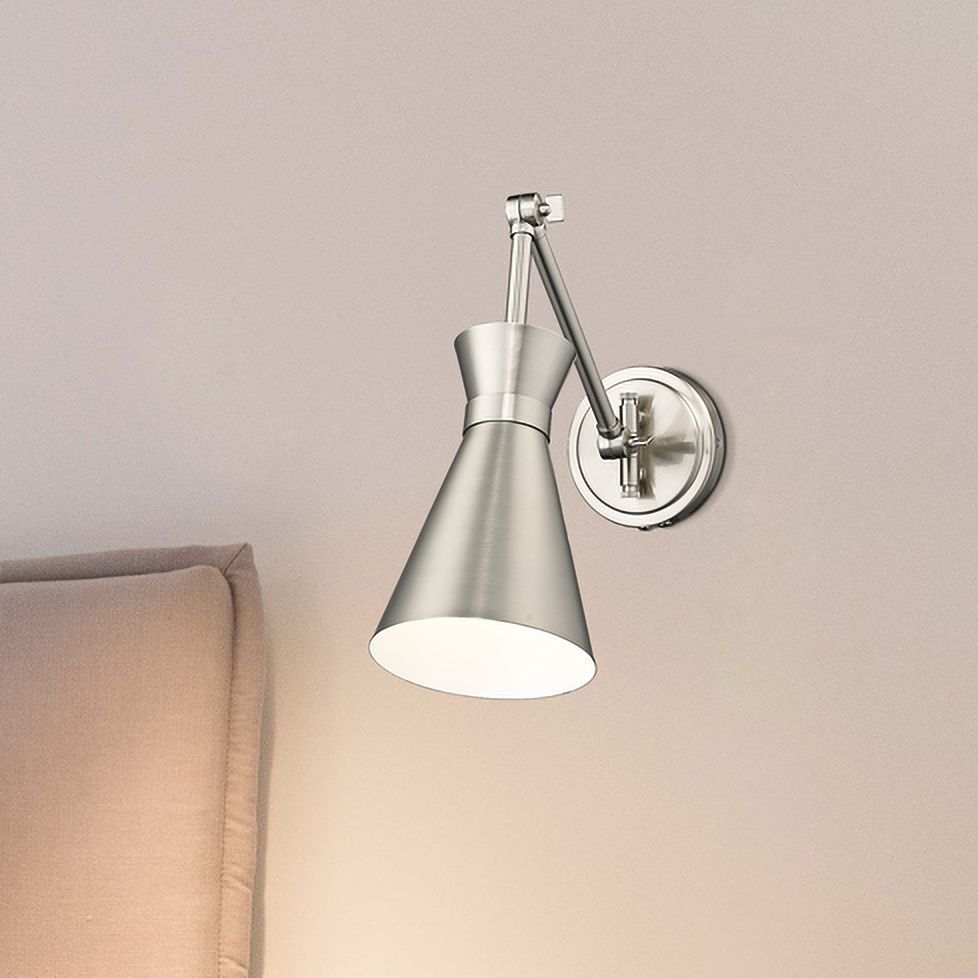Smooth functionality meets classic design in this industrial dimmable swing arm wall lamp's timeless brushed nickel finish.