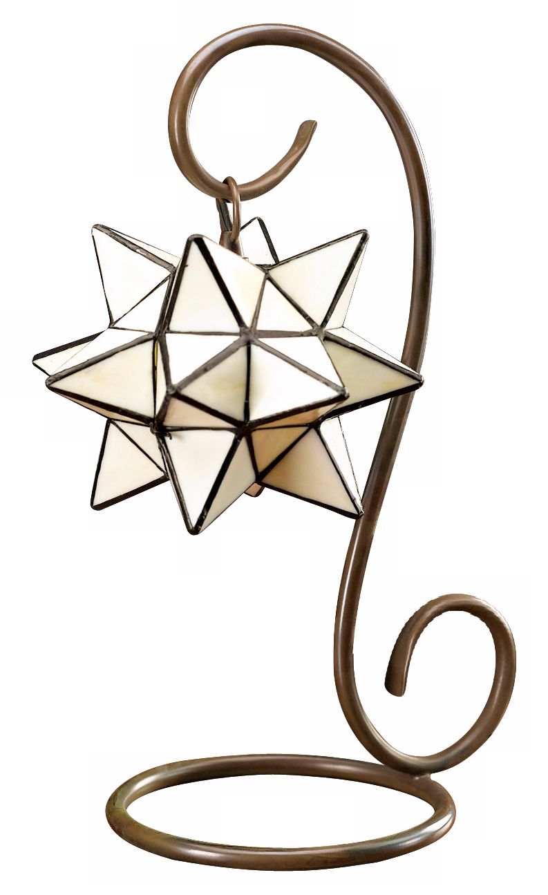 This star accent lamp offers good looks and a charming glow. The metal base scrolls gracefully and comes in a patina bronze finish. A candelabra fixture glows within a Tiffany style glass star. Make your decor more beautiful with this vibrant accent lamp.