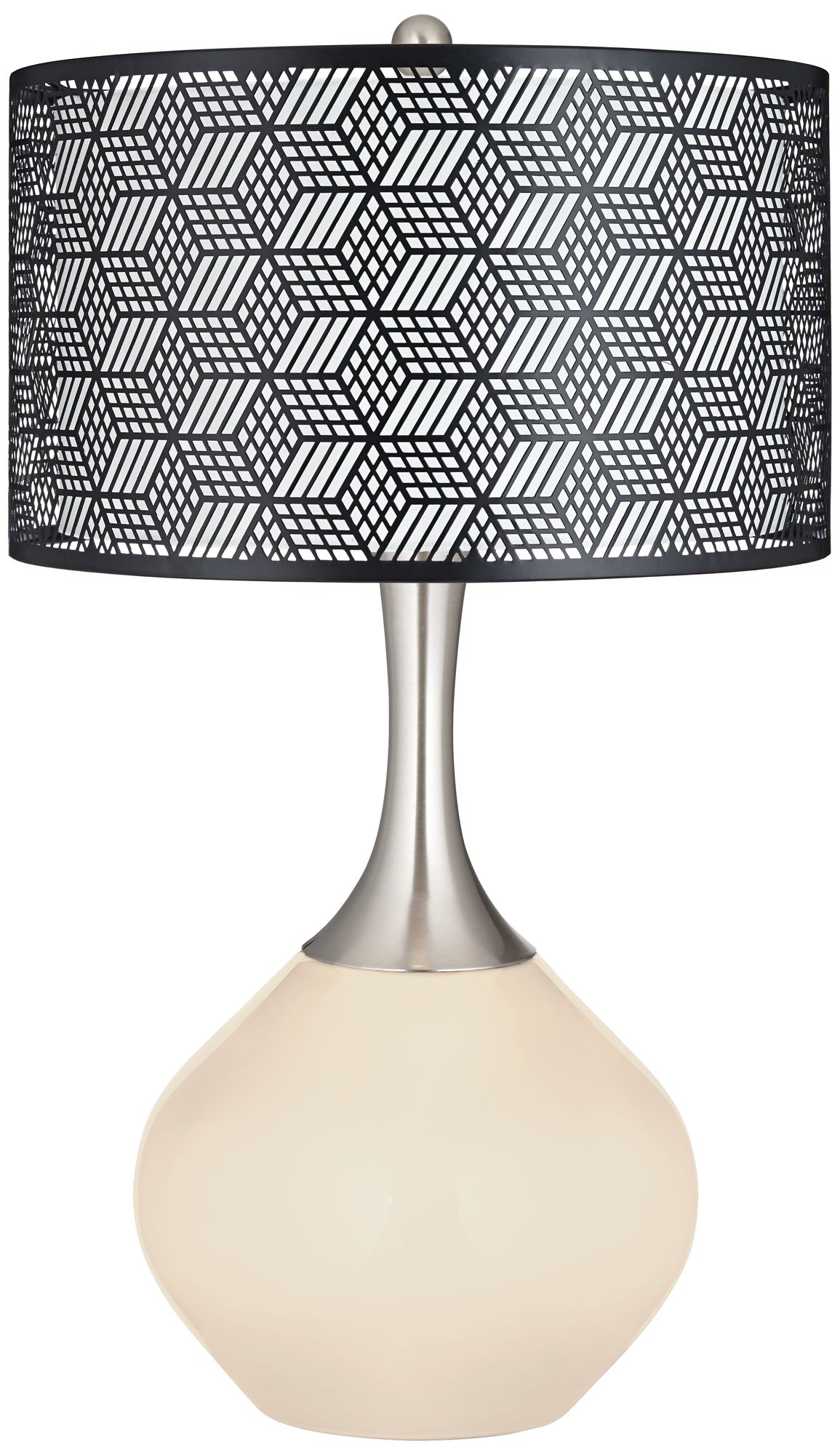 Give your living space a lift with the designer style of the Spencer Color+Plus™ glass table lamp. The base is hand-crafted by experienced artisans in California, and features a beautiful Steamed Milk white cream color tone. A graceful metal lamp neck in brushed nickel finish coordinates beautifully with a matching finial over the black laser cut metal shade to complete the design. Lamp base U.S. Patent # 8,899,798.