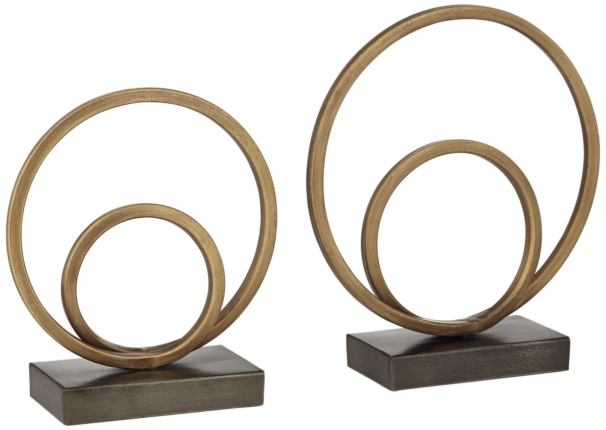 Side by side, this set of two modern ring sculptures deliver a classic look to a decor ensemble. Created of metal, this set by Studio 55D features metal construction with a hand-painted copper finish. A double-ring design brings geometric verve with a natural aesthetic. Choose this set as a primary decor element on a display table or fireplace mantel.