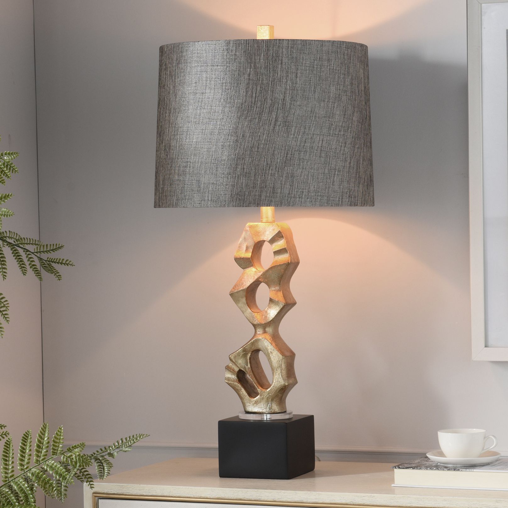 Its abstract gold base adds artistic flair, perfectly balanced by a textured gray fabric shade. This lamp brings modern luxury and warm illumination to any living room, bedroom, or office.