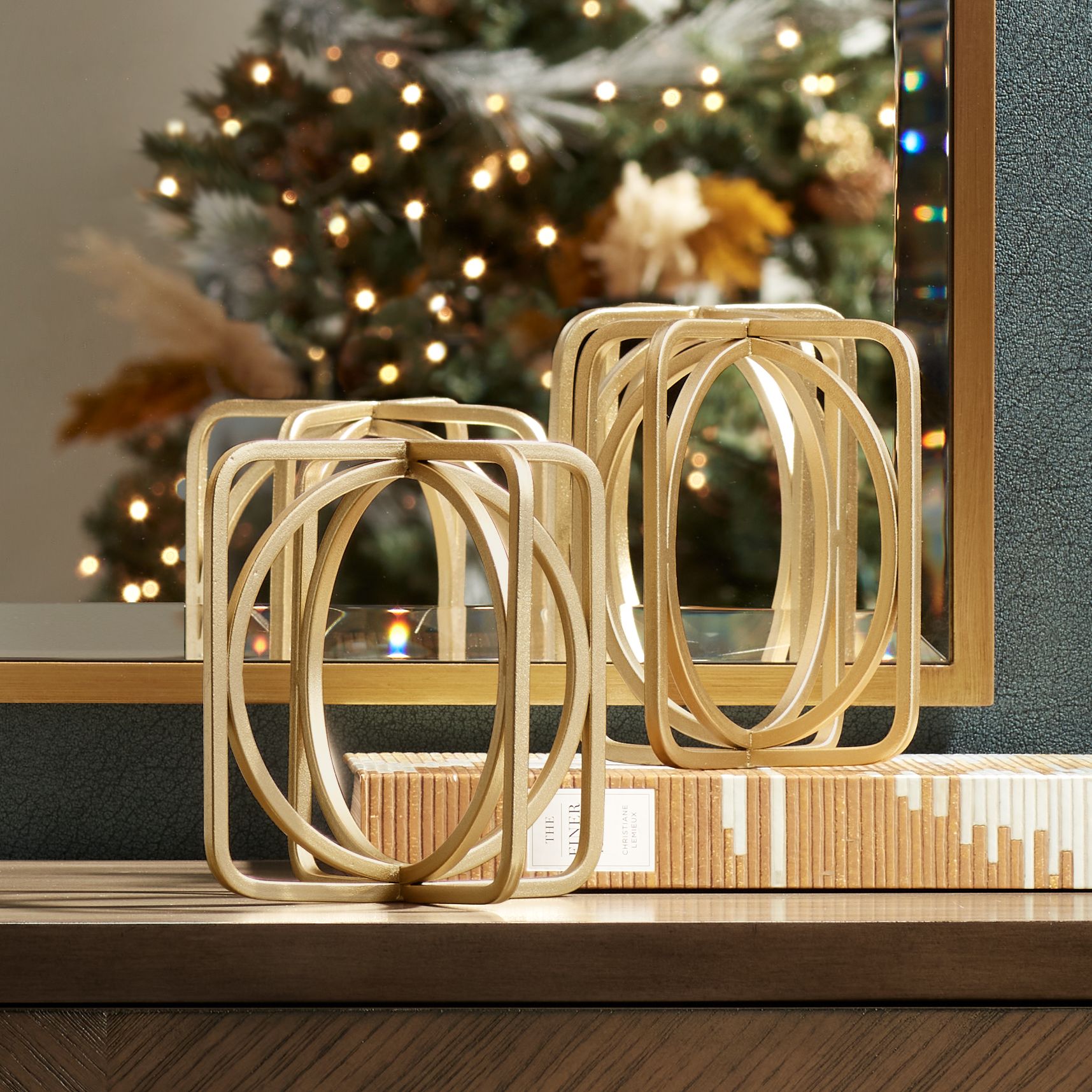 A blend of geometric silhouettes creates sheer artistry with an intriguing twist as this set of two metal decorative ornaments sit side by side to reflect good taste. Hand-made by Studio 55D, these gold finish metal figures from the Suffolk collection reflect elegance and contemporary attitude all in one. Two separate widths expand on a fresh visual effect.