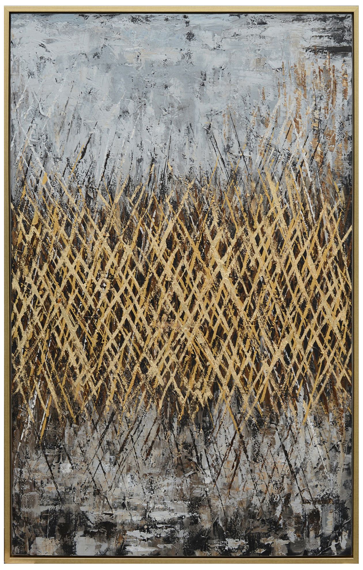 An art piece pairing gold details with a neutral color palette, the Surrounded wall art painting instantly upgrades your decor. Beautiful in a bedroom, living room, or office, this artwork displays hand-painted canvas inside a rectangular frame with a brushed gold finish. The abstract design has various tones of gray, white, black, and brown along with a gold crosshatched pattern.