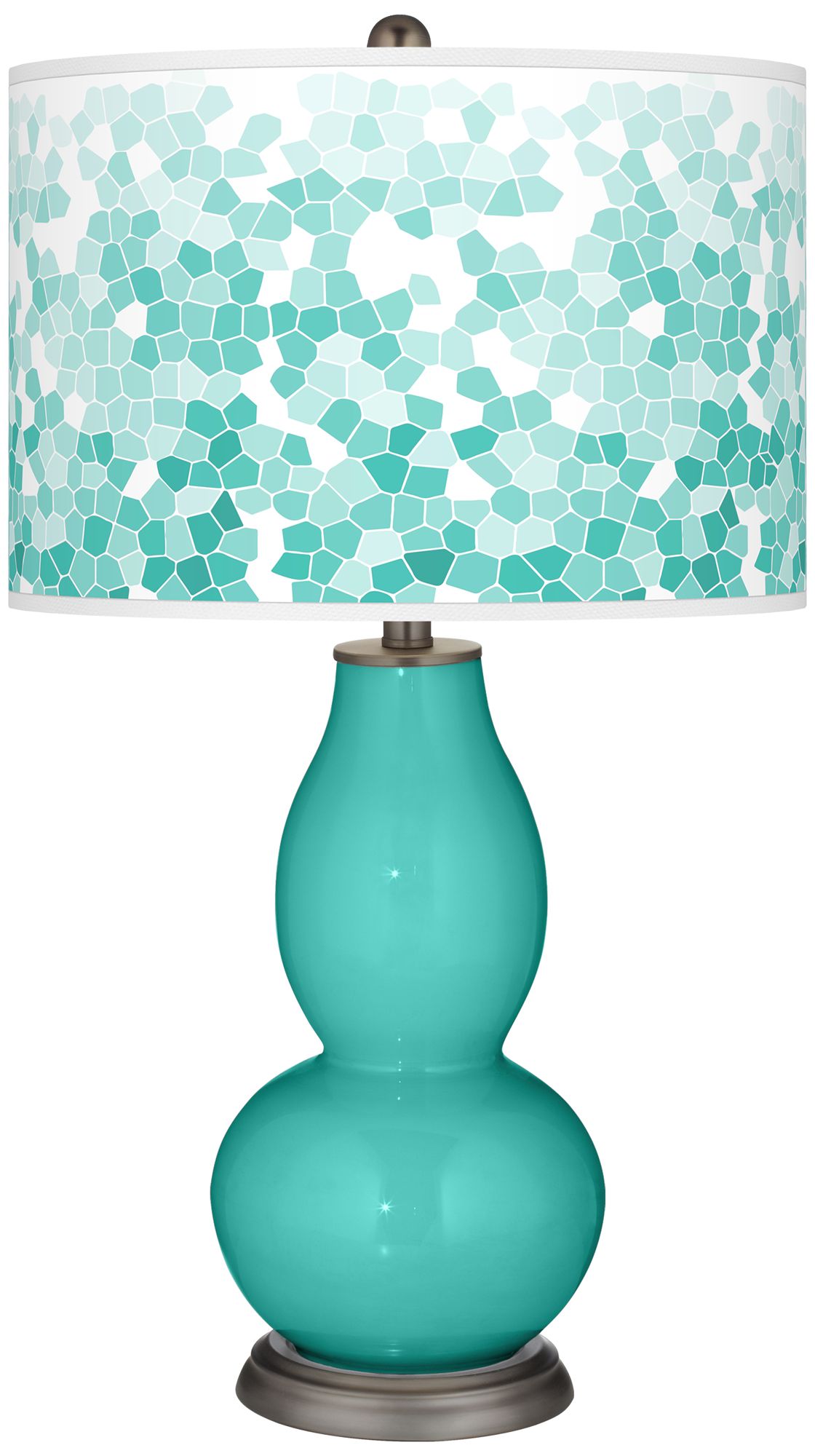 This double gourd glass table lamp from the Color + Plus™ collection offers a brilliant color accent for your home decor. The designer Synergy base is hand-crafted by our experienced artisans in California, and is topped by a custom-made lamp shade. The shade features an exclusive Mosaic pattern and is printed to order. Shade process U.S. Patent # 7,347,593. Lamp base U.S. Patent # 8,899,798.