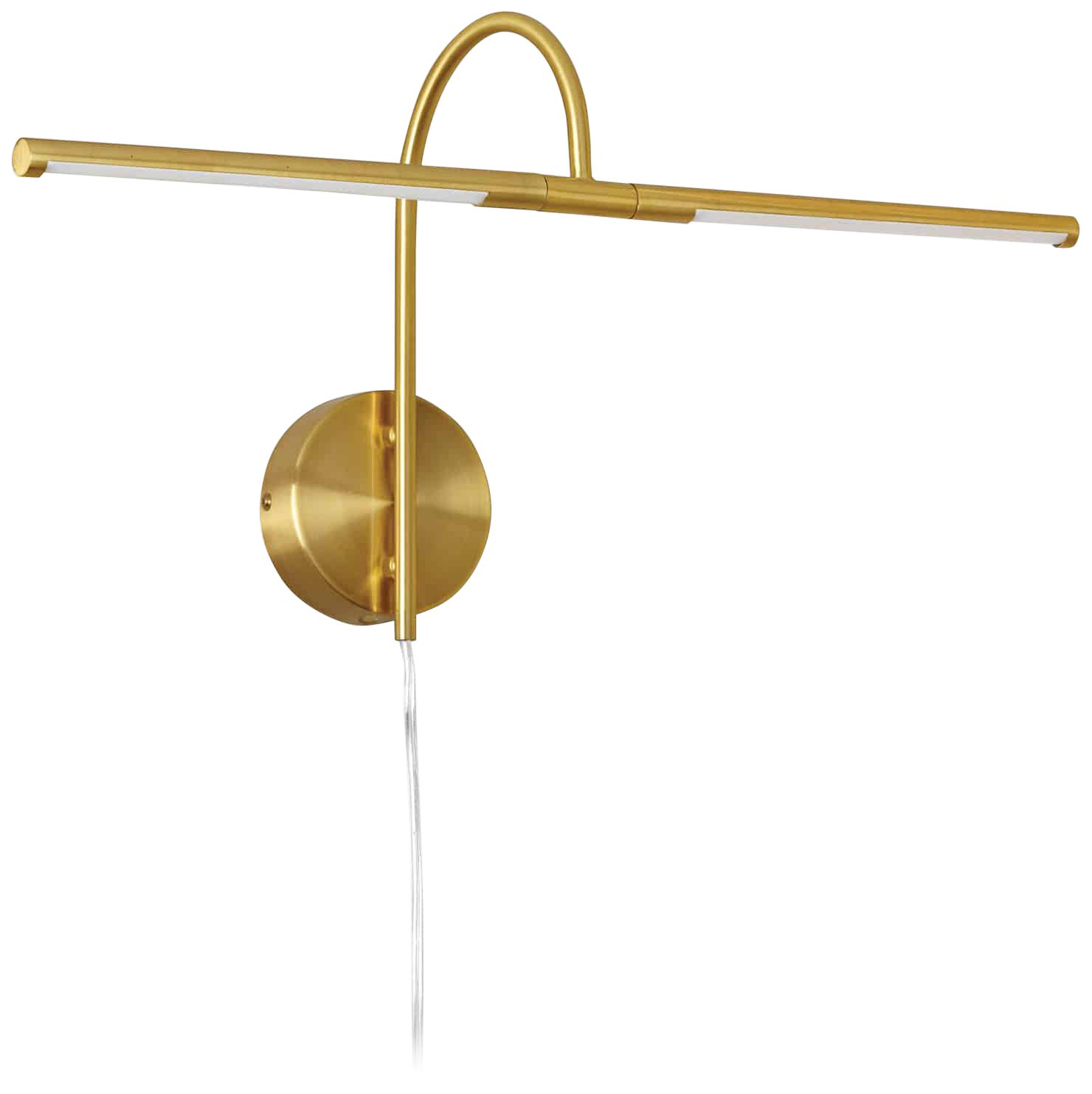 A slim shade and beautifully arching arm add graceful elegance to this modern two-light LED picture light. An aged brass finish lends eye-catching style while highlighting its generous length. This design is a plug-in style with a rocker cord on the switch for installation anywhere, and it features energy efficient LED modules that deliver a soft white 3000K color temperature.