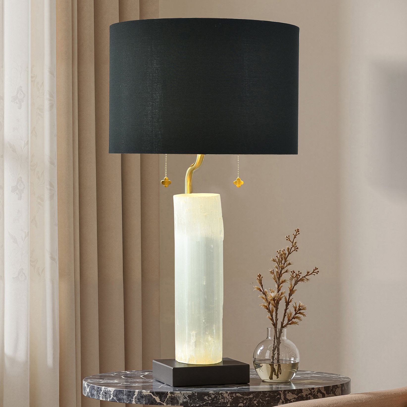 Transform your space with the Jasper Table Lamp, a perfect blend of selenite, metal, and fabric that creates a stunning visual statement. Inspired by Tamara Day's glam transitional designs, this lamp features a unique shade and pull chains adorned with quatrefoil charms, adding a subtle touch of boho charm to any room. Whether placed in your living room or bedroom, the Jasper brings warmth, style, and a versatile lighting solution that enhances a variety of home decor styles. Designed by Tamara Day, known for her ability to blend glam with cozy, this piece embodies her vision for the spirited home. As a busy wife and mother of four, Tamara expertly mixes luxury with comfort and family-friendly appeal, creating spaces that are both beautiful and welcoming.