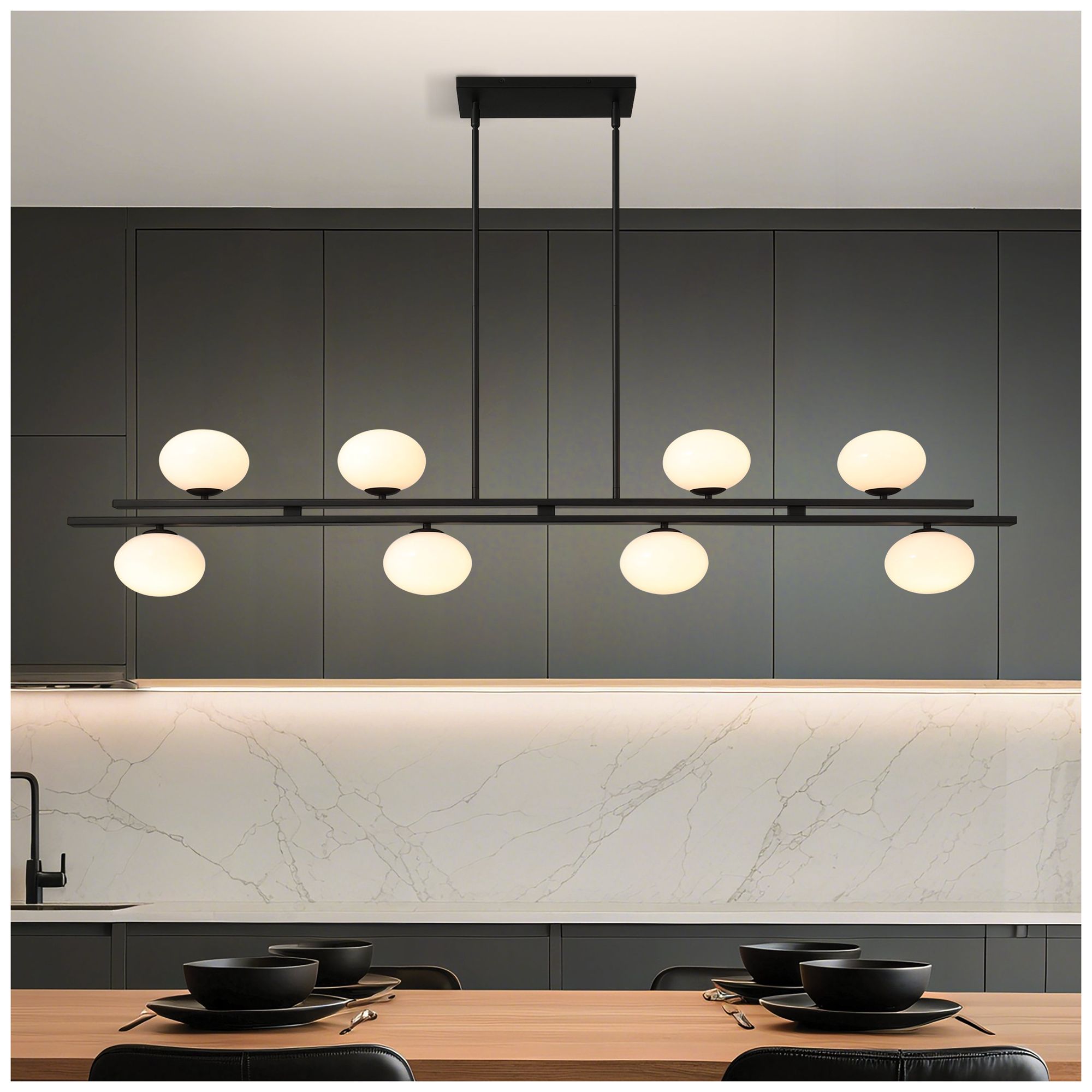 5_Thesis Julep 64" 8 Light Matte Black Linear Chandelier w/ Opal Glass Shades more views