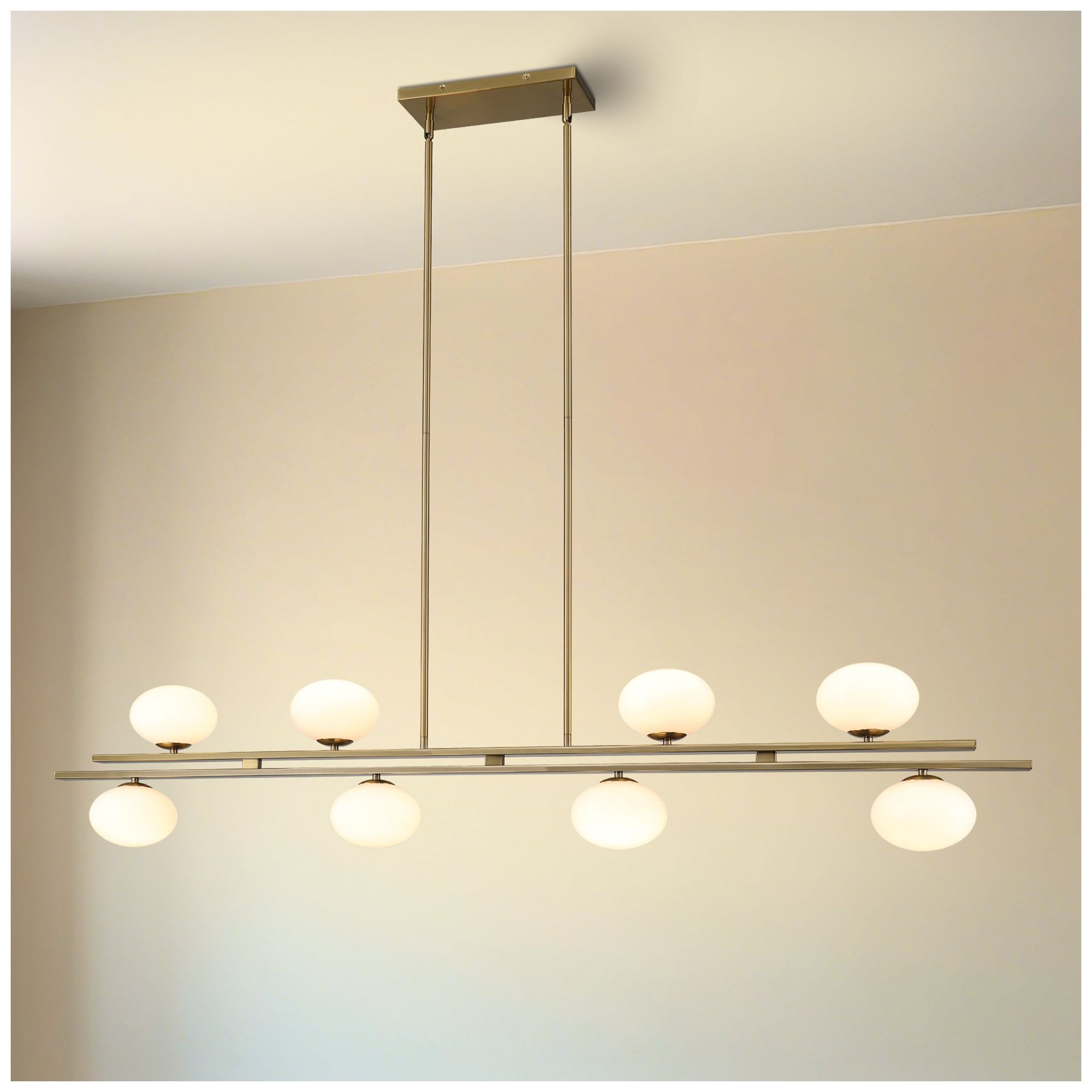 Thesis Julep 8 Light Brushed Gold Linear Chandelier w/ Opal Glass Shades