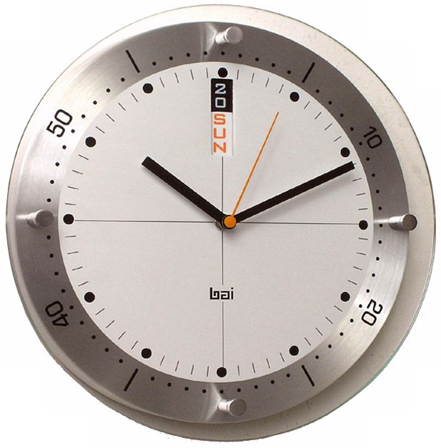 Master time management with this stylish clock featuring an asymmetrically beveled, brushed aluminum bezel marked at 10-second intervals. Its quadrants are accented with polished aluminum knobs, and its white finish dial is marked with dots at five-second intervals.