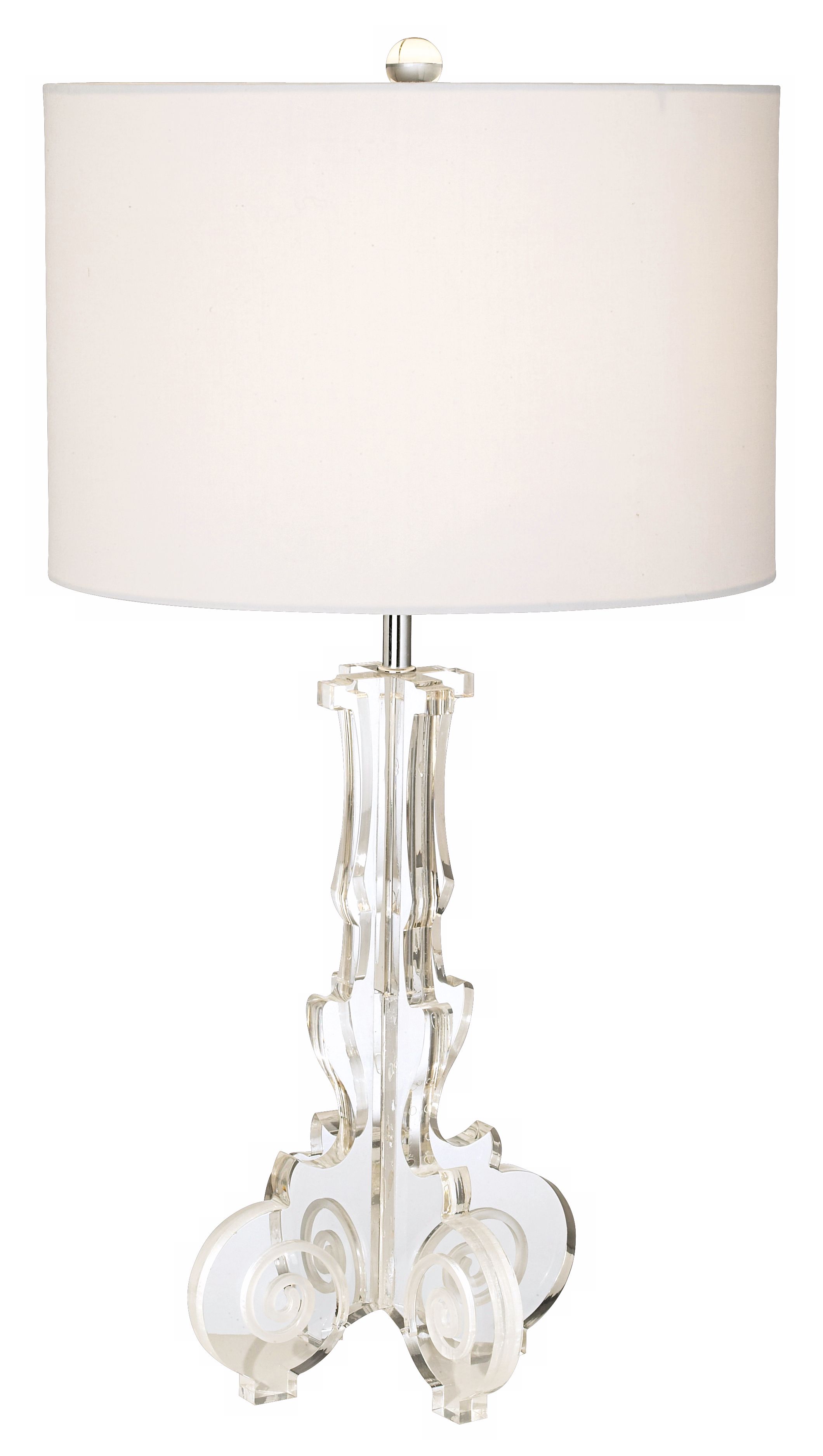 Traditional scrollwork is translated into transparent acrylic for a unmistakably modern look. A white drum shade tops the table lamp.