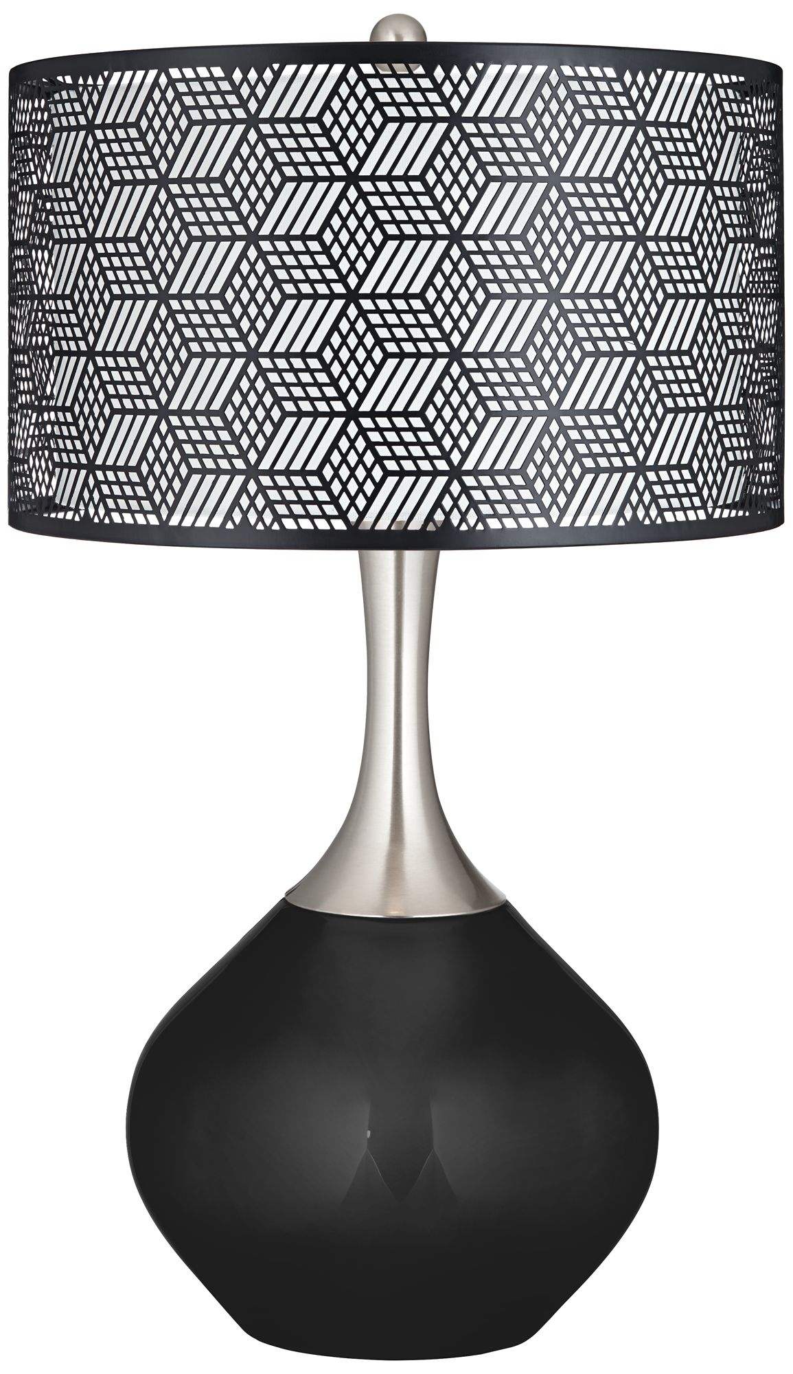 Give your living space a lift with the designer style of the Spencer Color+Plus™ glass table lamp. The base is hand-crafted by experienced artisans in California, and features a beautiful Tricorn Black color tone. A graceful metal lamp neck in brushed nickel finish coordinates beautifully with a matching finial over the black laser cut metal shade to complete the design. Lamp base U.S. Patent # 8,899,798.