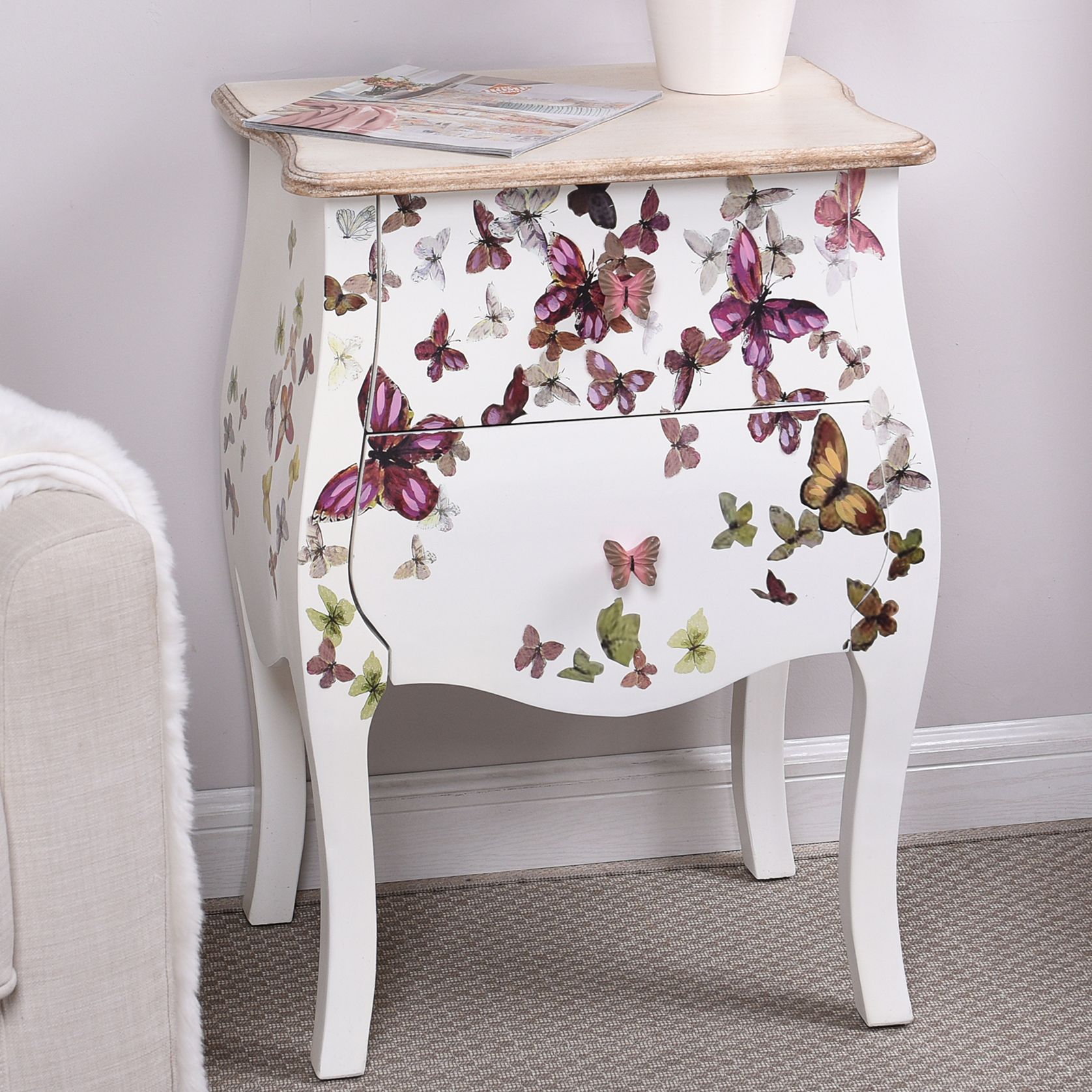 Add a little whimsy to your home with this two drawer, butterfly accent cabinet. Hand-painted purple, red, pink, yellow and blue butterflies flutter across the white body, adding an instant pop of color that drawers the eye. The durable body is made from fir wood and MDF and comes complete with a natural wood finished top.