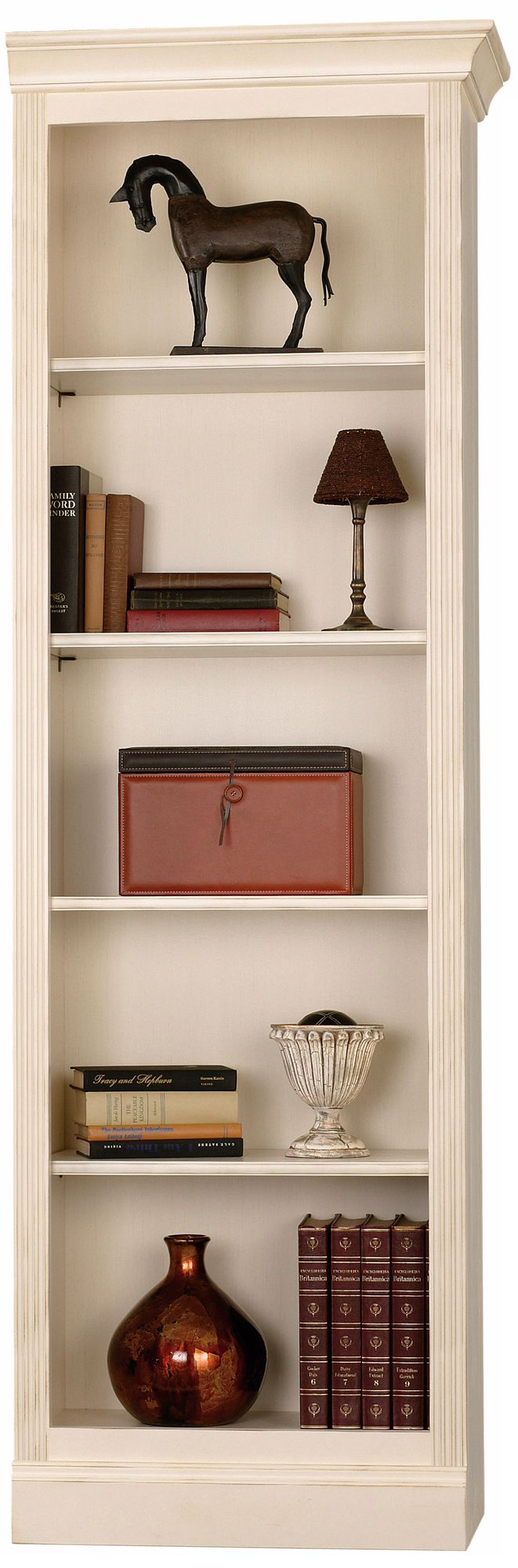 Ty Pennington, home decor expert and television host, has teamed with Howard Miller to offer Howard Miller Home Storage Solutions by Ty Pennington. This stately wall storage unit from the Oxford Collection is constructed from select hardwoods and veneers, finished in Antique Vanilla, and features a fluted front frame. A wraparound pediment on the right only makes it easy to create your own arrangement by combining this piece with others from the Oxford Collection. Three of its four shelves are adjustable, allowing you plenty of space to showcase your treasures. Adjustable levelers under each corner provide stability on uneven and carpeted floors.