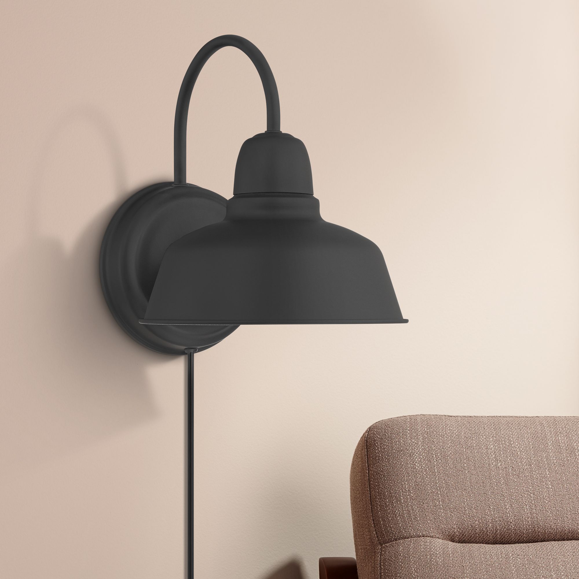 From the Urban Barn collection by John Timberland, this plug-in wall sconce comes in a charming industrial farmhouse style. The steel frame features a wide downlight shade attached to the end of a thin, arching gooseneck arm. A matte black finish adds a classy and refined touch. Perfect for use in a home office or living space.