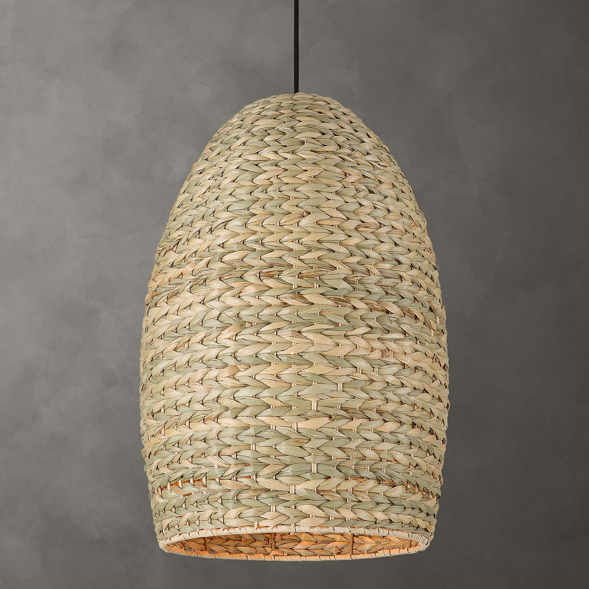 - Antique brass accents. Handwoven natural corn rope shade.