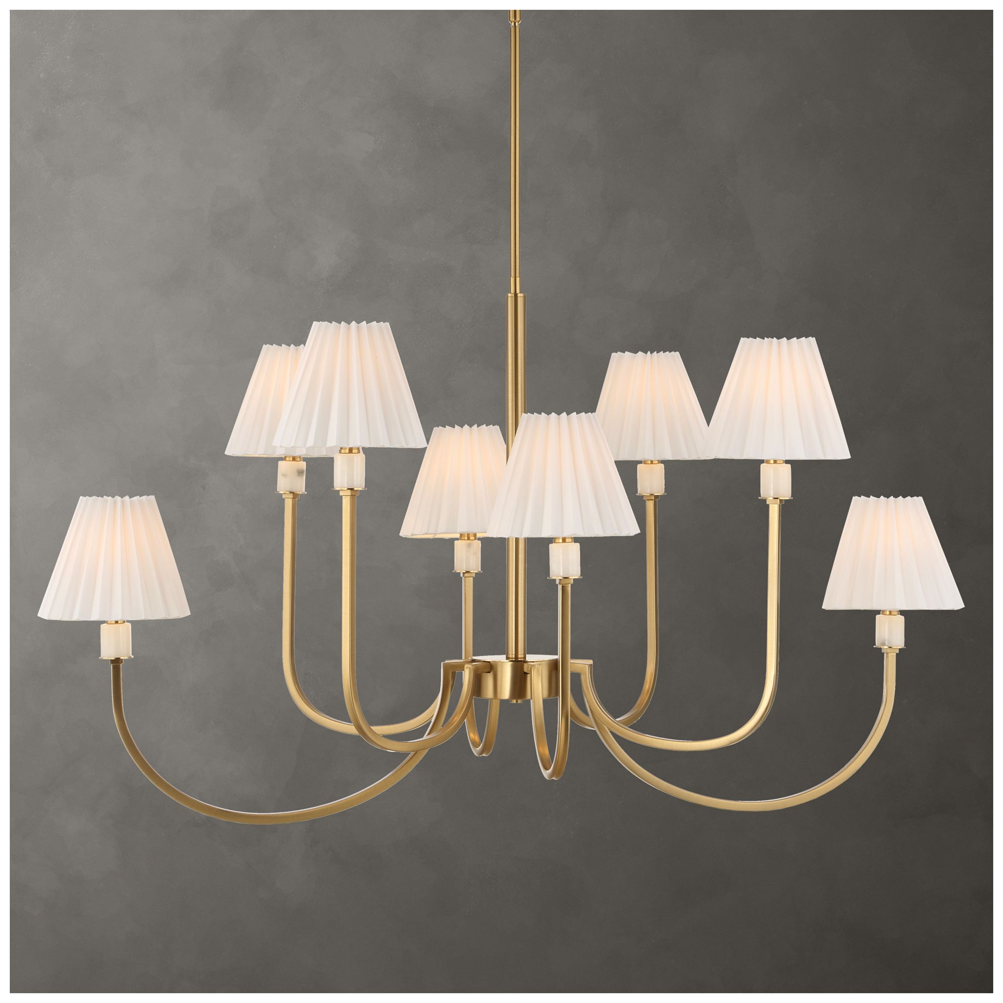 Charming 8 Lt oval chandelier featuring a warm brass finish with white alabaster accents topped with pleated white fabric shades. 8-60 watt max candelabra sockets. Bulbs not included. Supplied with 20' wire, 3-12" stems and 1-6" stem for adjustable installation.