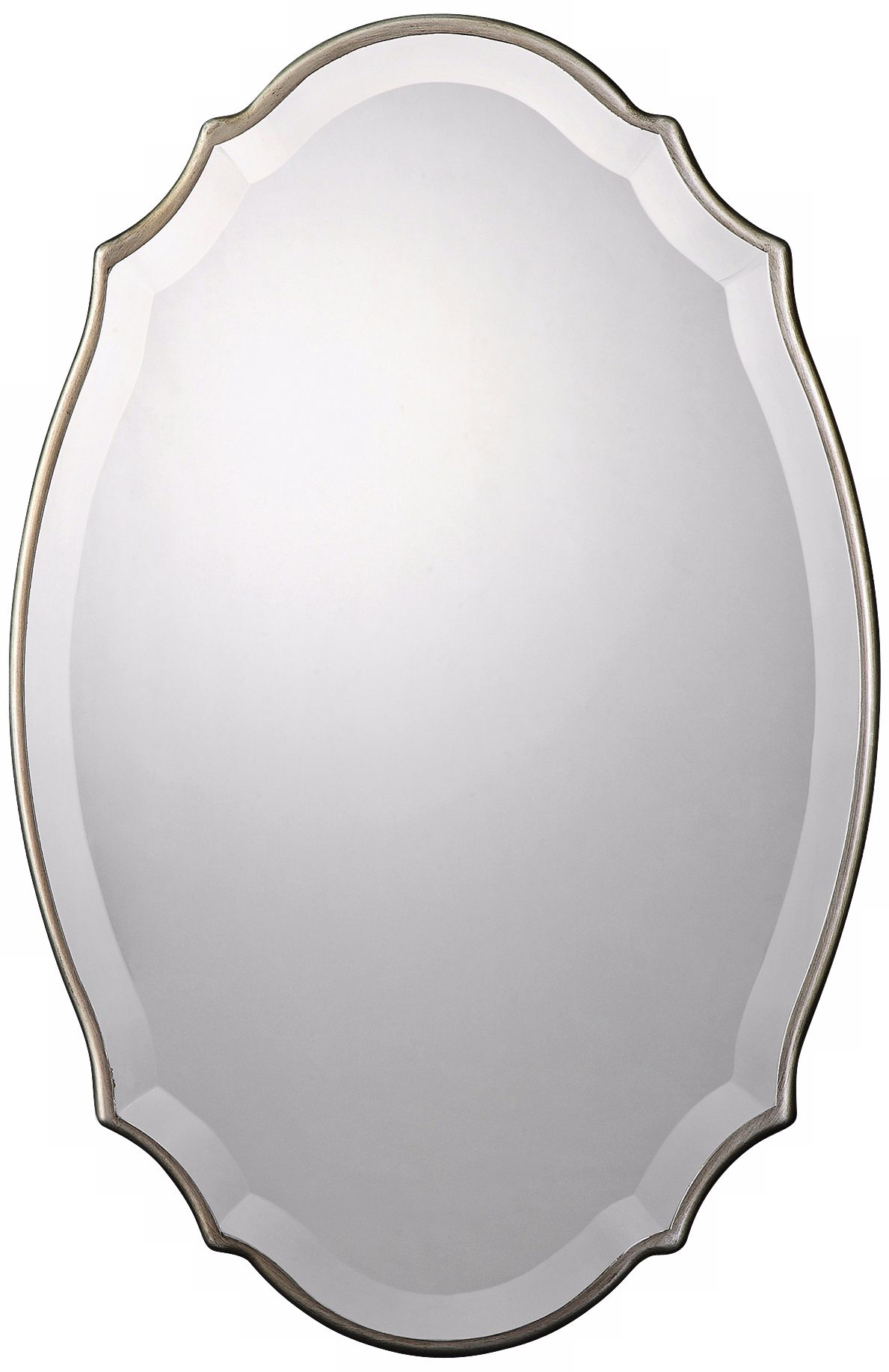 Add some distinctive elegance to your home with the Sannita oval wall mirror from Uttermost. Gently curved frame has a lovely silhouette. Burnished silver details give this piece a lovely patina. Beveled mirror glass follows the shape of the frame for a great effect. Wonderful piece for a hallway, bath or bedroom.