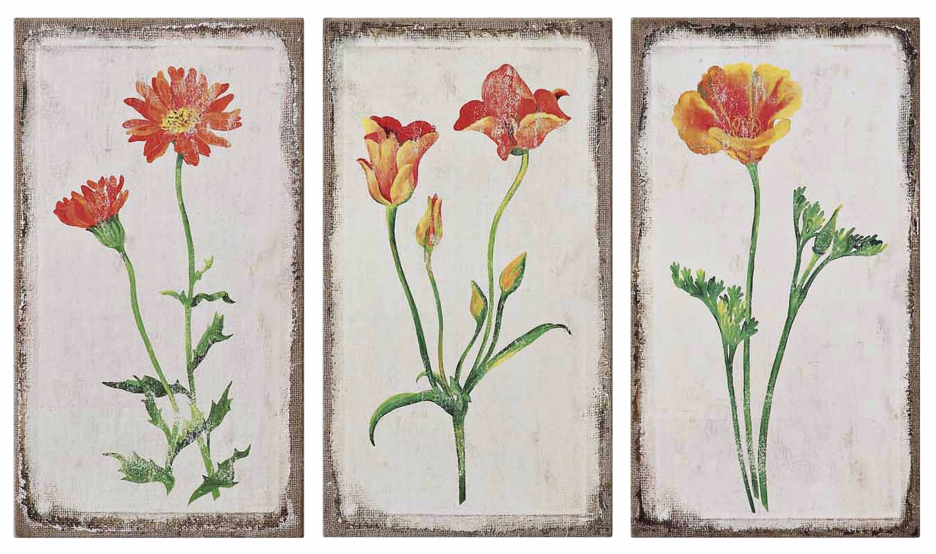 Beautify your favorite space with cheerful floral wall art. The Casual Change collection features a set of three charming wildflower images, printed on line and antiqued burlap for a collectible appeal. From the artisans at Uttermost, these pretty prints are finished with a board backing and are ready to hang with included sawtooth hangers.
