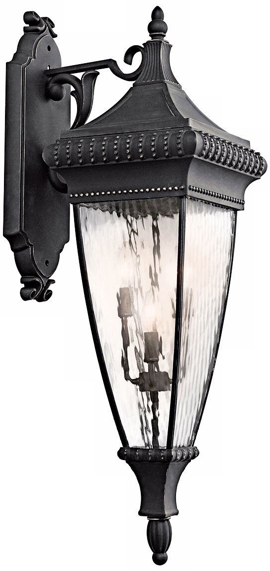 In a beautiful classic black finish, this outdoor wall light from Kichler features Vertical Rain glass and a shapely form inspired by traditional European designs. Brighten patios, porches, and other areas with this distinctive lighting design. From the Venetian Rain Collection by Kichler outdoor lighting.