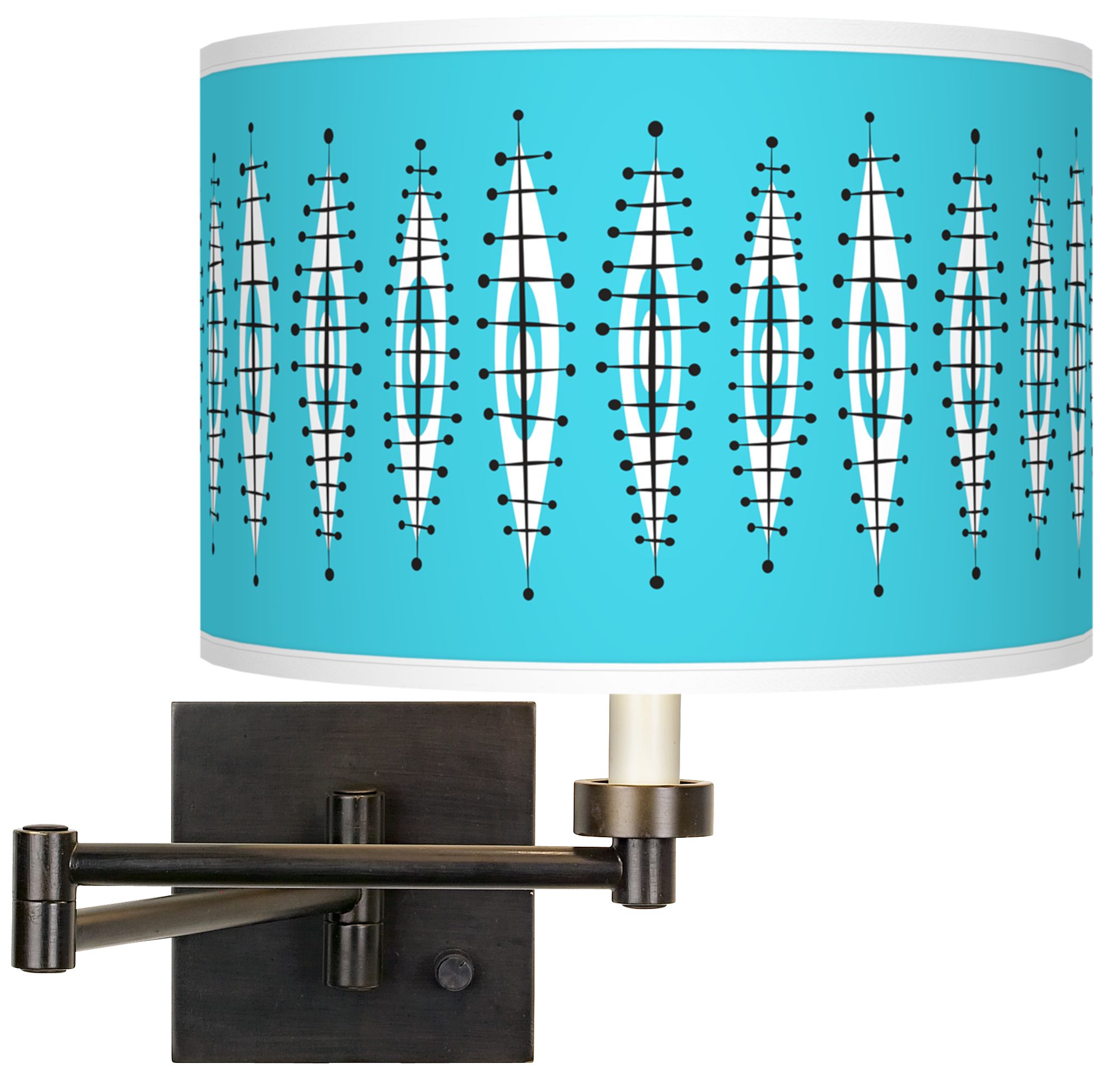 Give your decor a contemporary lift with this giclee shade swing arm wall lamp featuring a custom made-to-order Vibraphonic Bounce pattern shade. The stylish shade pattern is exclusive to us, and designed by retro modern pop artist and illustrator Ragnar. The base comes in a warm bronze finish, and has a dimmer switch that allows you to easily adjust the light output. Ample 24" arm extension adds even more convenience to this easy-to-install plug-in lamp. Shade printing process U.S. Patent # 7,347,593.