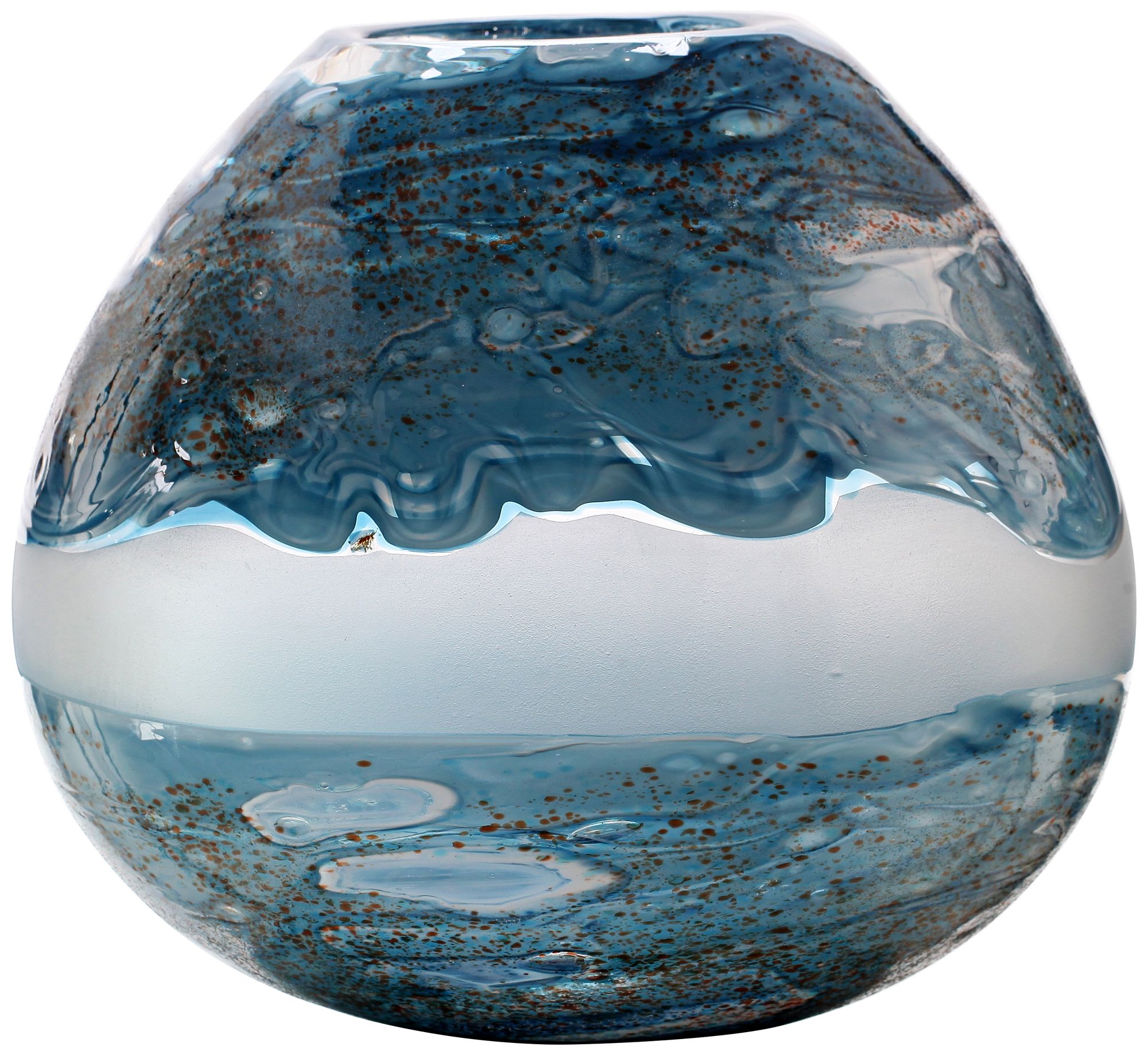 In hand-blown glass, this contemporary art glass vase lends a sophisticated look to any surface. From Viz Glass, this vase features a rounded profile with shades of aqua blue and clear.