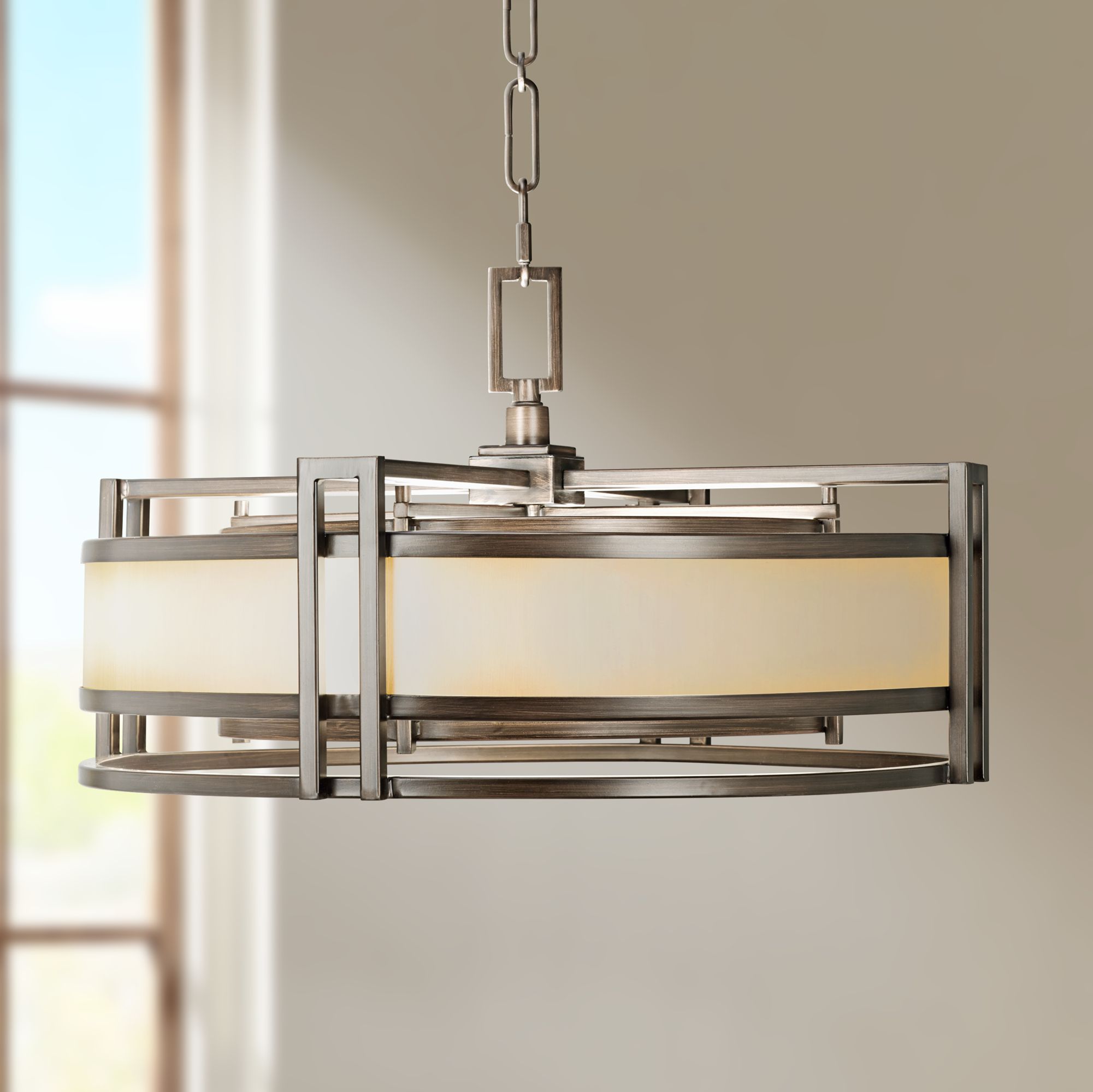 This radiant design comes from the Walt Disney Signature lighting collection. Inspired by Disney's classic films and sense of style, this fixture highlights your decor with transitional silhouettes and clean lines. This drum pendant light features a Cimarron bronze finish and brushed caramel silk glass. From Walt Disney Signature by Metropolitan Lighting.