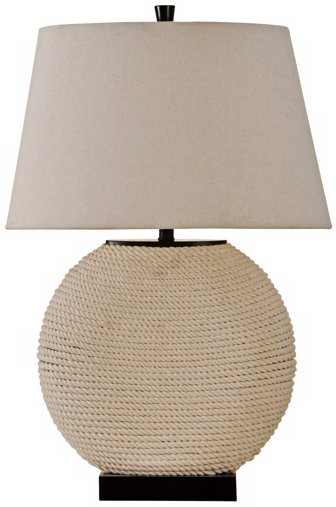 Add a bit of organic, nautical style to your decor with this textured rope table lamp. Round base features a textured finish that evokes banded lines of light rope. Black, rectangular base and matching finial add a great contrast. Linen shade provides a diffuse, warm glow. A stylish lamp with great texture and visual details.