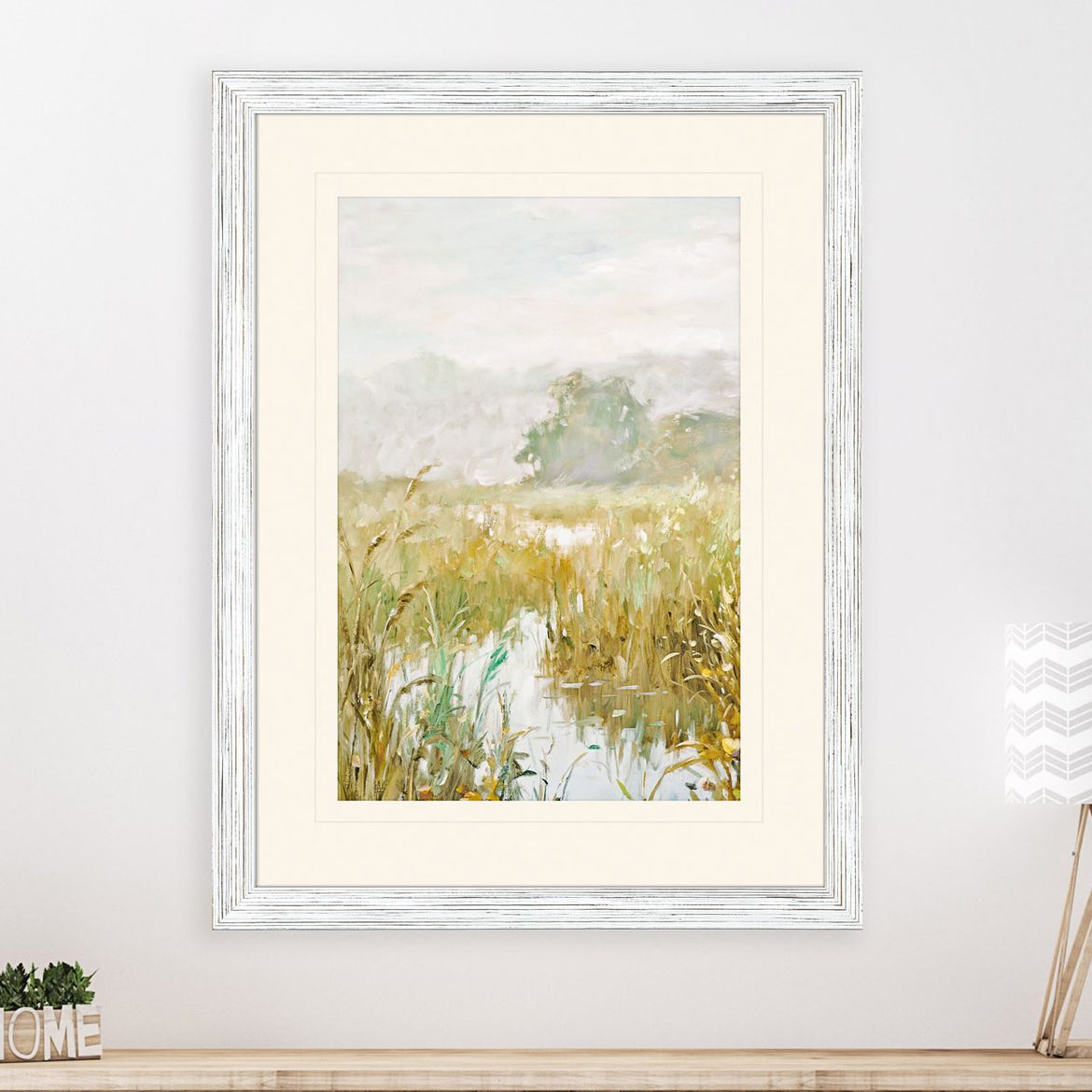 A montage of glorious colors creates easy elegance in this modern rectangular framed wall art. Created with giclee printing, its vibrancy and detail are enhanced as a meandering stream theme invokes a soothing influence. This wall art from the Whispering Winds II collection features white-washed finish distressed wood framing with a ribbed face and is matted in white. Made to order in USA.