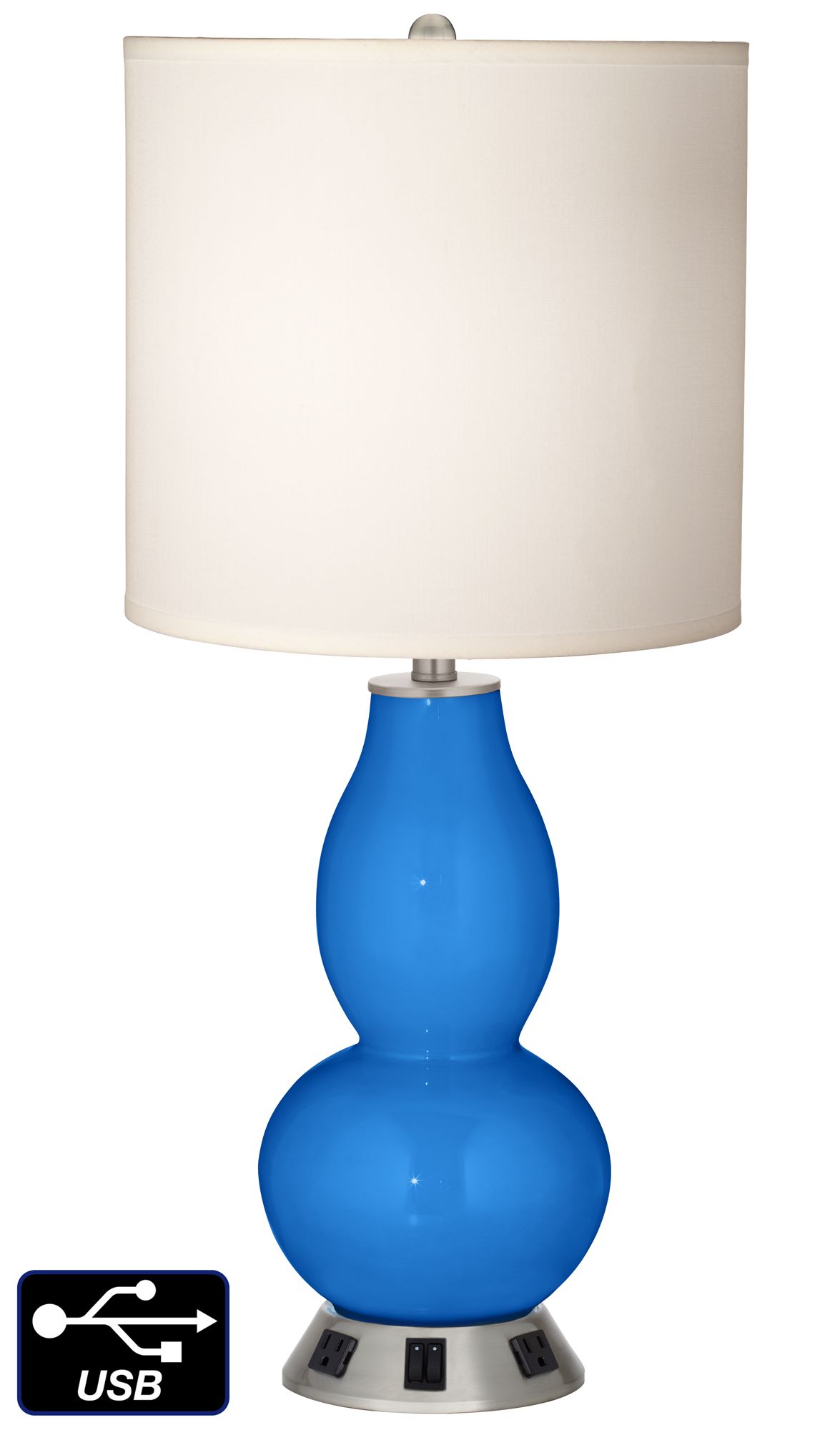 This gourd shaped table lamp in Royal Blue features two convenience electrical outlets and 2 USB ports on the base.