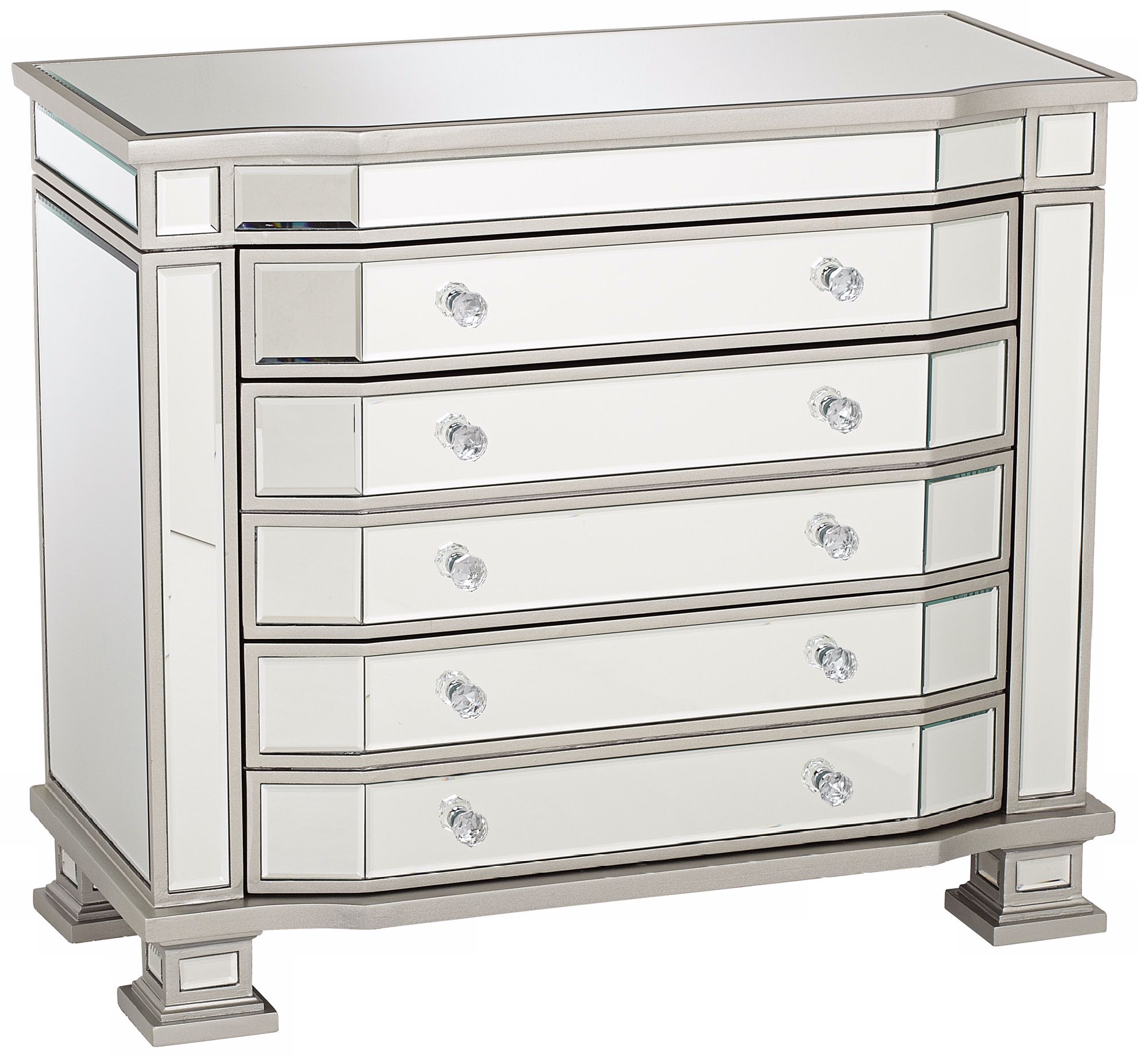 This wonderful accent chest of drawers will give your home decor a boost. Get some glam with this 3-drawer accent chest, finished with clear mirror on its top, side and front. Its convenient size makes it perfect for tight spaces. Two large bottom drawers and one shallower top drawer. Design is by 55 Downing Streetâ„¢ designer furniture.