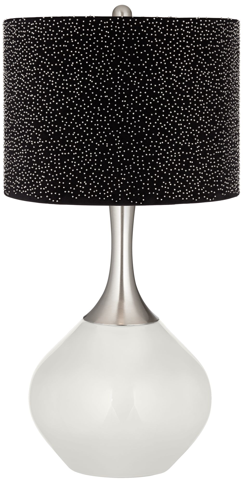 The Spencer Color + Plus™ table lamp is an exquisite home style upgrade. Hand-crafted by experienced artisans in California, the base features a beautiful Winter White color tone that is elegantly complemented by a graceful metal lamp neck in brushed nickel finish. A coordinating finial over the black scatter gold shade draws the look together and completes the design. Lamp base U.S. Patent # 8,899,798.