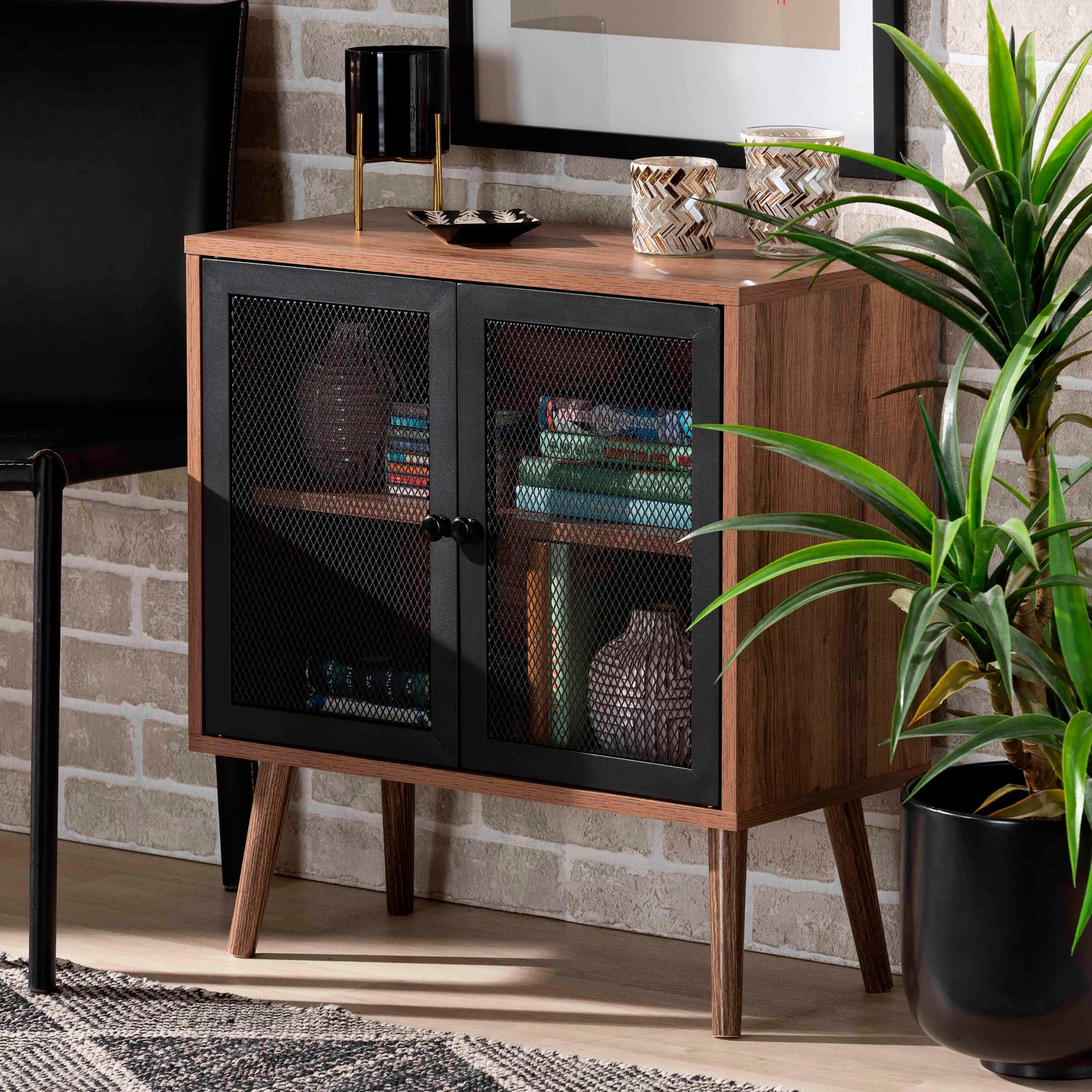 Two black mesh panel doors adorned with round black knobs lend an industrial flair to this retro-inspired two-door storage cabinet, allowing you to present decor, kitchenware, and more inside. A boxy natural brown frame lends a rustic earthy look and feel, situated on flared tapered legs for a retro-inspired aesthetic.