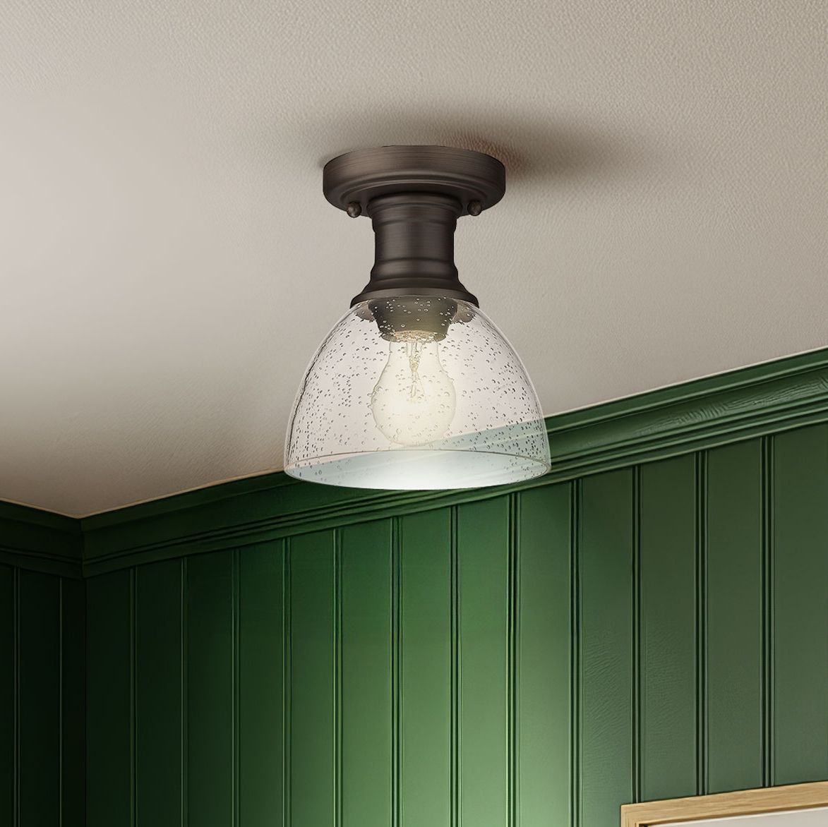 Hines 6 7/8" Wide 1-Light Semi-Flush in Rubbed Bronze with Seeded Glas