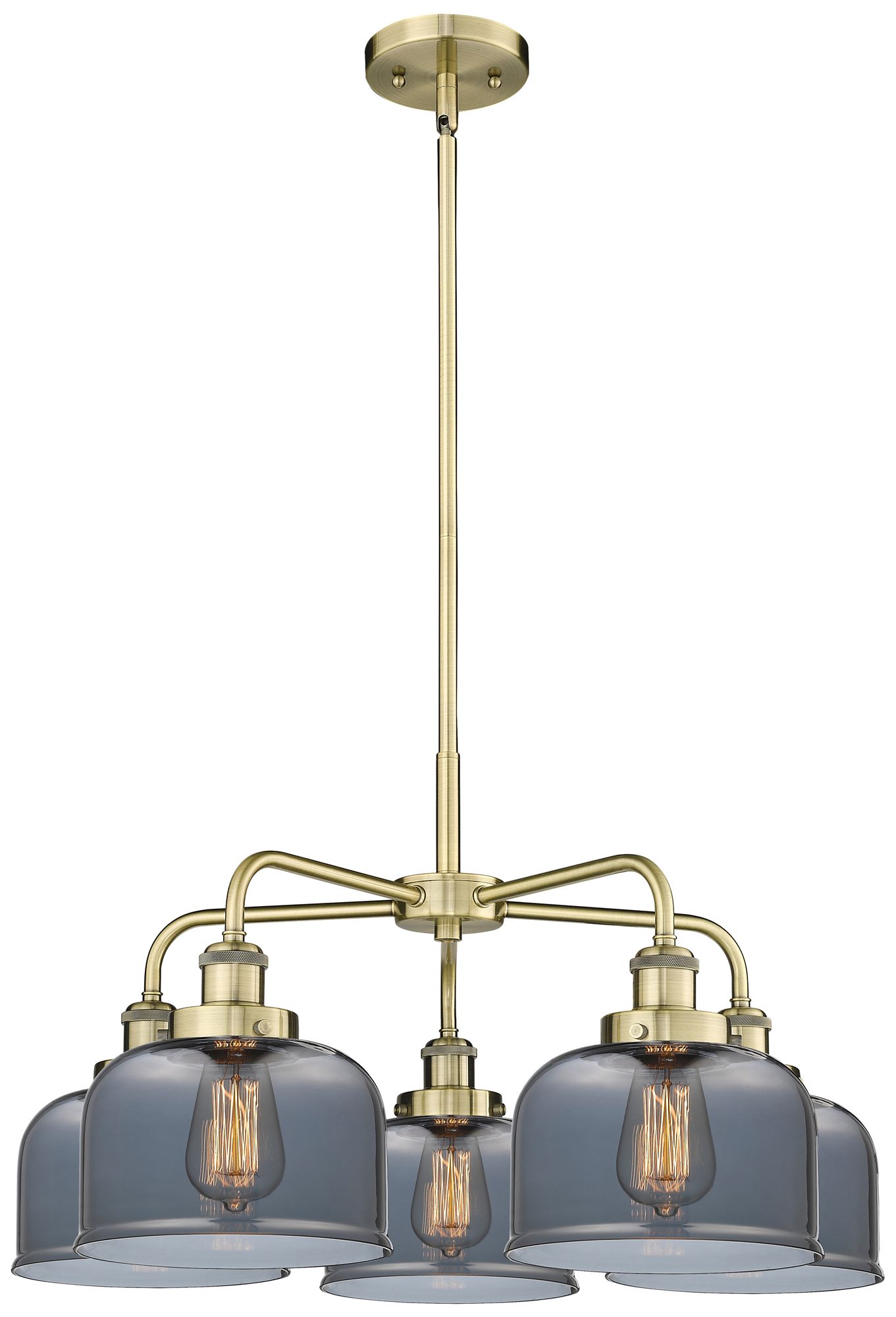 Bell 26"W 5 Light Antique Brass Stem Hung Chandelier w/ Smoke Glass Sh