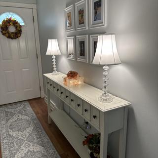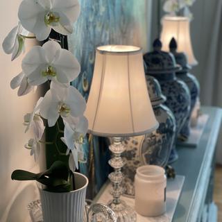 An elegant table lamp set with a bohemian-inspired style, from the 360 Lighting brand. Each lamp features a column fashioned from clear stacked glass elements, which lend a classic traditional appeal to the designs. Up top are off-white lamp shades with a flared bell profile. The pair of lamps offer a bright look that's ideal for living room lighting, accenting bedroom side tables, or use to add a little glamour to foyers and entry areas.