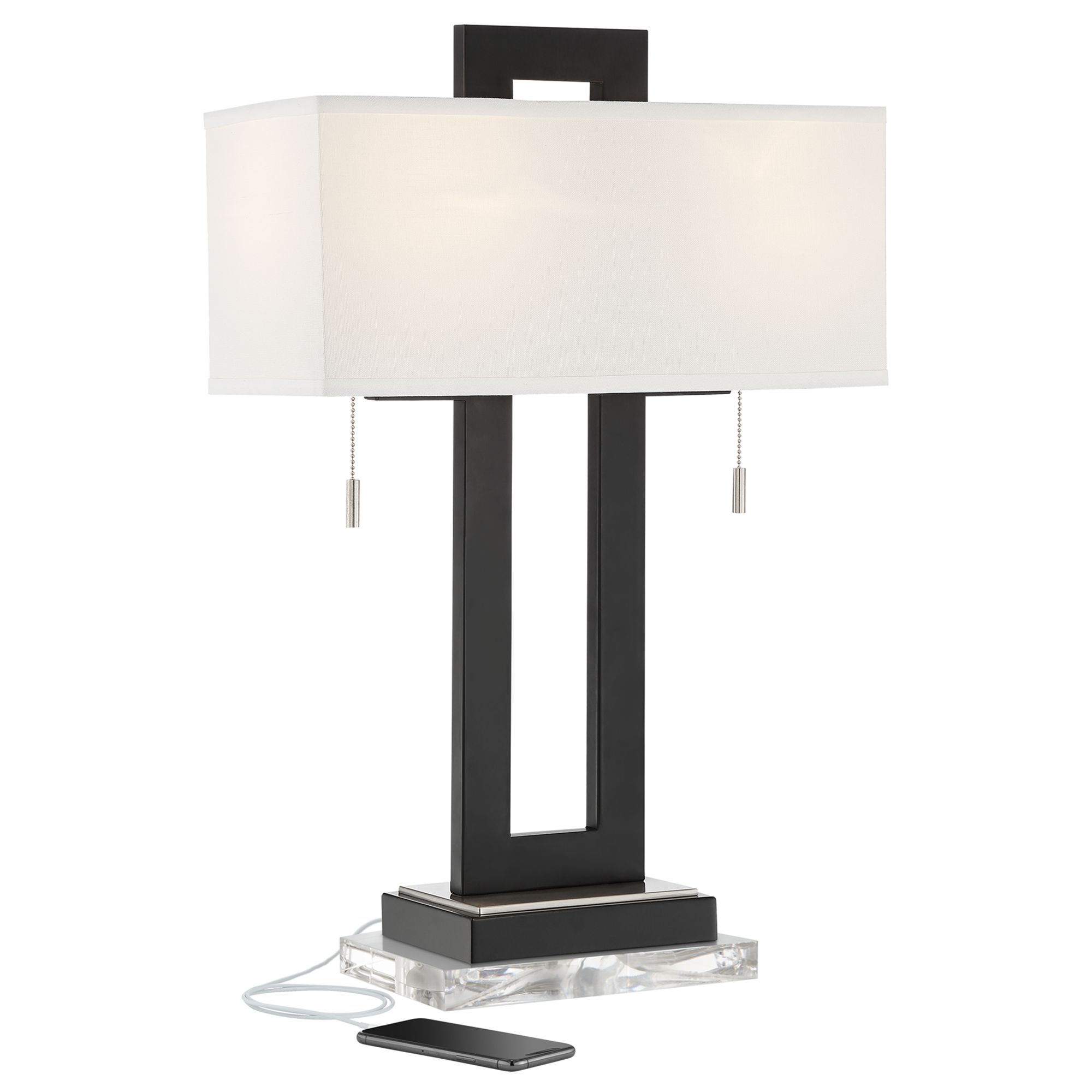 A contemporary two-tone look and convenient amenities are showcased in this modern table lamp from the 360 Lighting brand. The metal construction of this lamp comes in a handsome dark finish that's topped by contrasting silver tone accents. On top is a rectangular shade that puts a crisp, clean finishing touch to this geometric design. With its charging port, this geometric, visually striking lamp is perfect for a modern bedroom or family space. Comes with a clear acrylic riser stand that lends the lamp extra height and style.