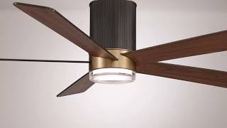 • Matte black finish motor with soft brass finish accents. Five dark walnut finish manufactured wood blades.