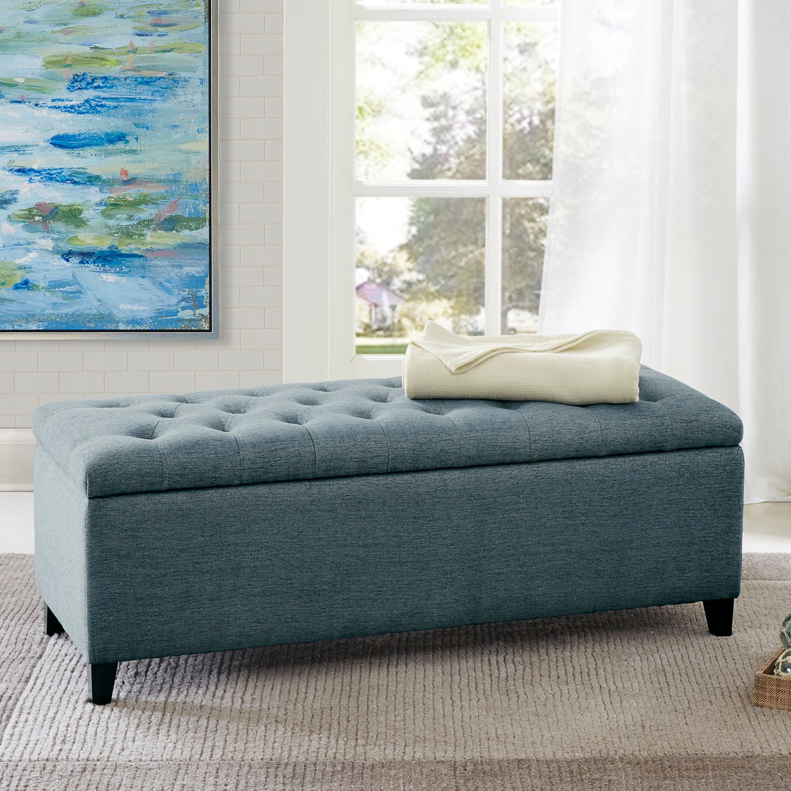 Sasha 50 1/4" Wide Peacock Blue Fabric Tufted Storage Bench