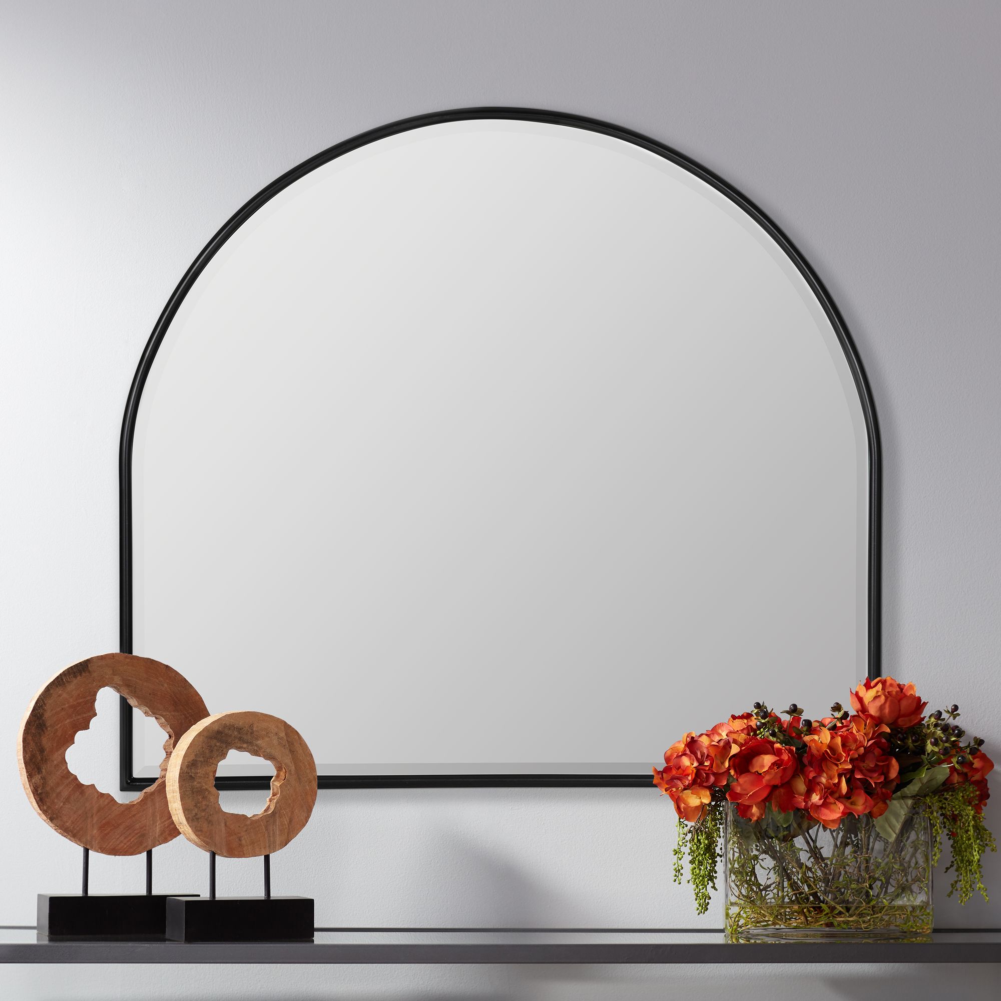 Design-forward silhouetting widens a classic arched top shape as this modern metal wall mirror becomes a fashionable choice for all settings. From the Allyson collection by Cooper Classics, this mirror is hand-finished with a matte black finish metal frame. Beveled glass adds a dimensional aspect. Use this sleek mirror inside or outside.