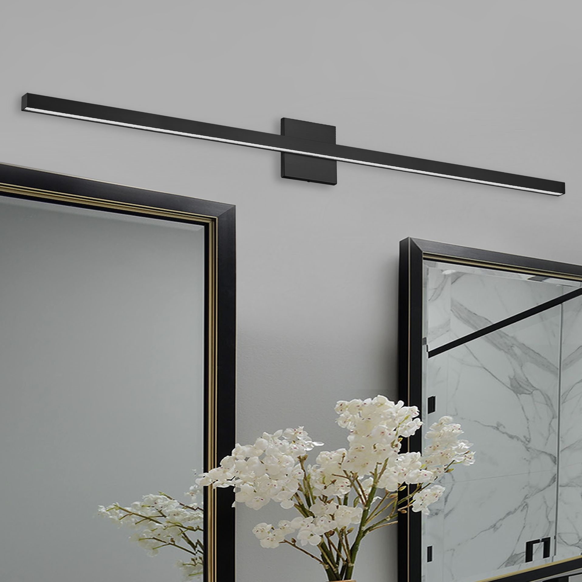 With a painted black finish metal body and acrylic diffuser, this modern LED bath light adopts a slender geometric silhouette.