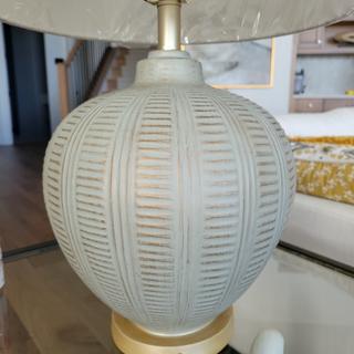 • White linen drum shade. Includes 5-foot long cord. Finial is 2" high.