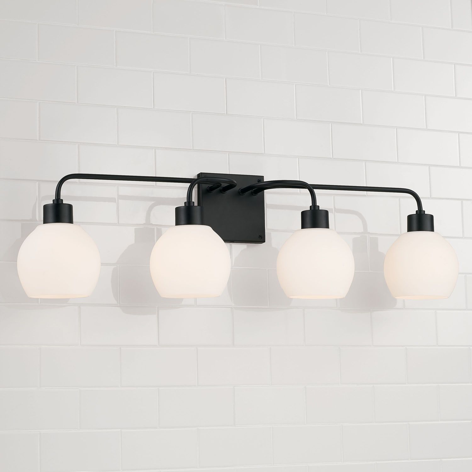 Some lights just do it all, and this modern four-light stunner is one of them. A sleek matte black finish keeps things bold, while soft white glass globes add an irresistible glow. Straight from the Tanner collection, this beauty balances contrast and warmth for a perfectly styled space. Whether you're getting ready or winding down, this fixture always sets the right mood.