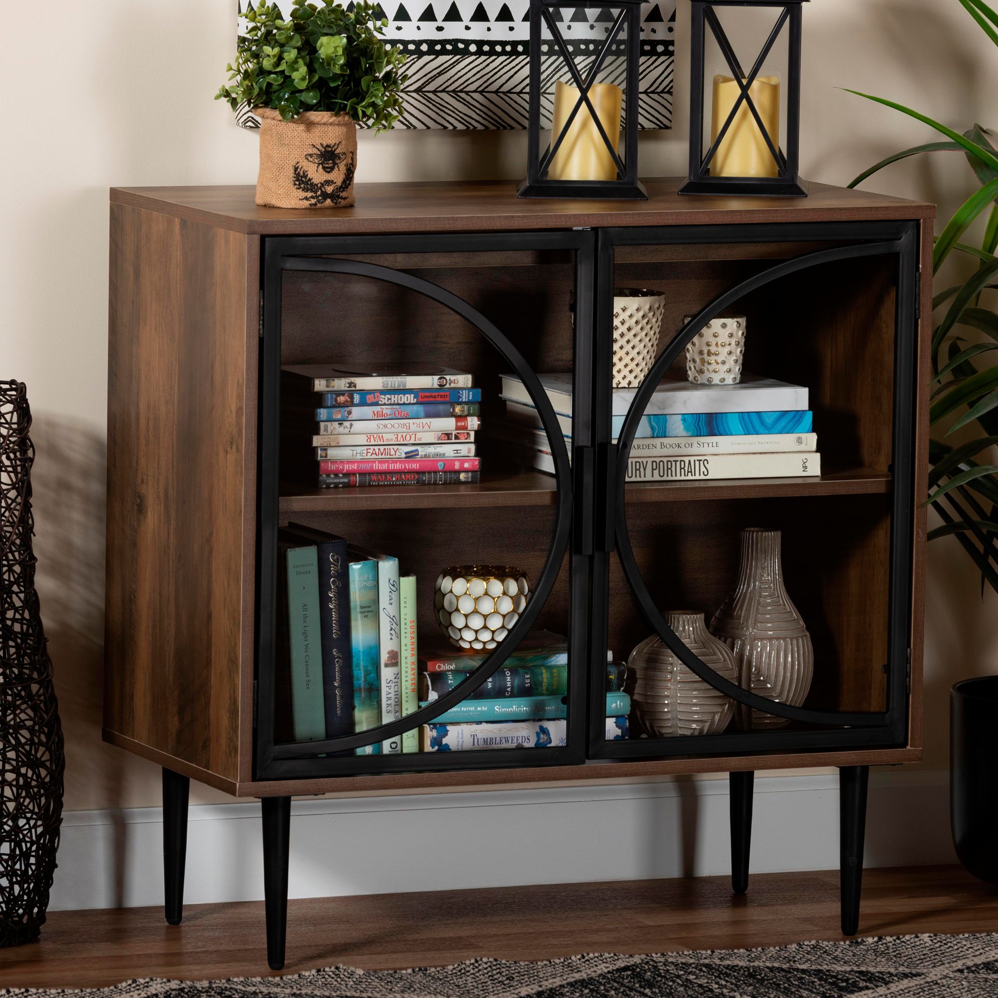 From the designers at Baxton Studio, this Mid-Century Modern two-door sideboard overflows with sophisticated character and dimensionality. The compact case shows off a warm walnut brown finish for earthy appeal, with decorative door fronts that pack a punch in any room. The glass doors are decorated with demi-lune overlays set within matching black finish metal framing to bring bold style and elegance. Tapering legs complete the look, while two shelves within the cabinet are ideal for all types of storage.