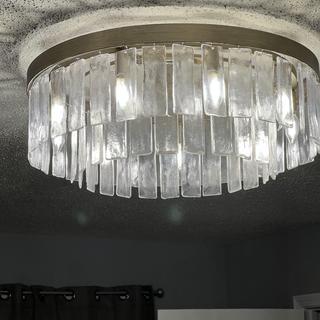 Stunning and dramatic, this modern glam nine-light flushmount ceiling light from the Ciara collection by Golden Lighting features a clean, contemporary design. Like sheets of ice, panels of hammered glass pour over wide metal hoops, forming a layered drum shade enclosing the inner lamps. The diffused light allows admirers to experience the beauty of transparent glass without blinding glare.