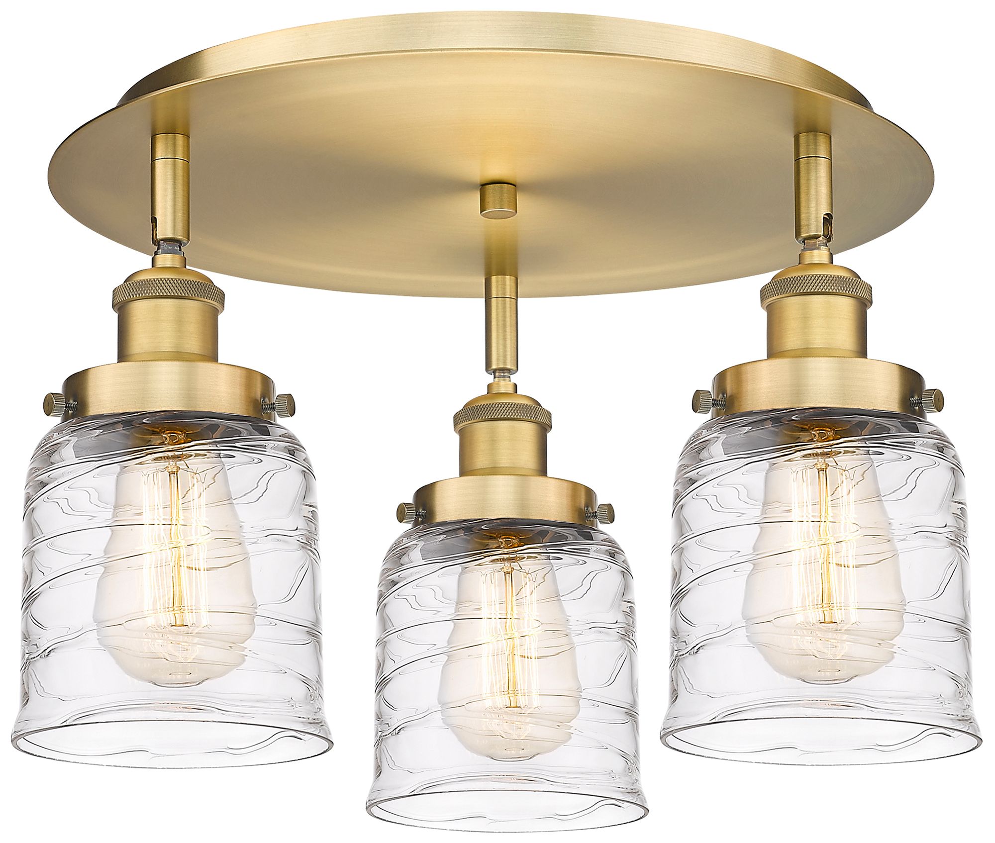 Bell 16.75"W 3 Light Brushed Brass Flush Mount w/ Clear Deco Swirl Sha
